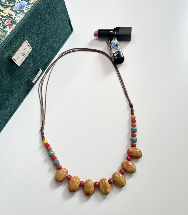 Un colier cald și vibrant, cu mărgele ceramice ovale ocru-maronii (16 mm), alternate cu bile roșii și verzi (6–8 mm) și un accent de galben solar.
