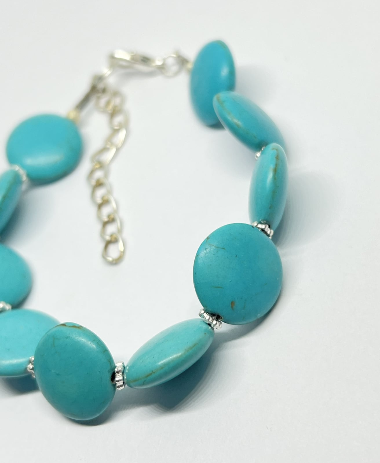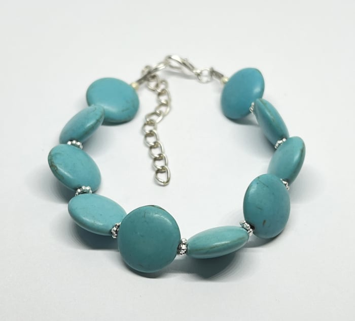 Brățară realizată manual din pietre semiprețioase turcoaz reconstruit, cu inserții metalice argintii. Nuanța vibrantă de albastru-turcoaz evocă liniștea cerului senin și energia calmă a mării. Ideală pentru un look boem, estival sau pentru a adăuga o notă de prospețime ținutelor de zi.