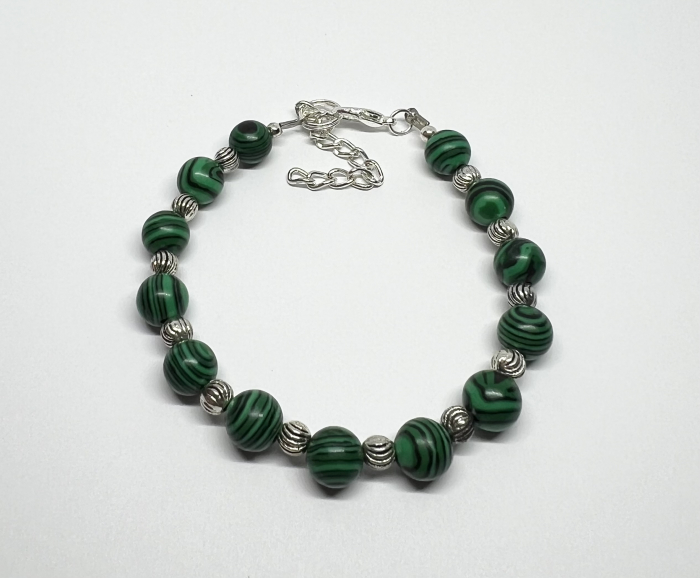 Cu un design vibrant și sofisticat, brățara Emerald Stripes este realizată manual din mărgele de malachit sintetic, evidențiate de dungile sale naturale verzi și negre. Între fiecare piatră, elementele argintii adaugă un plus de strălucire, oferind un look elegant și versatil, potrivit atât pentru zi, cât și pentru seară.