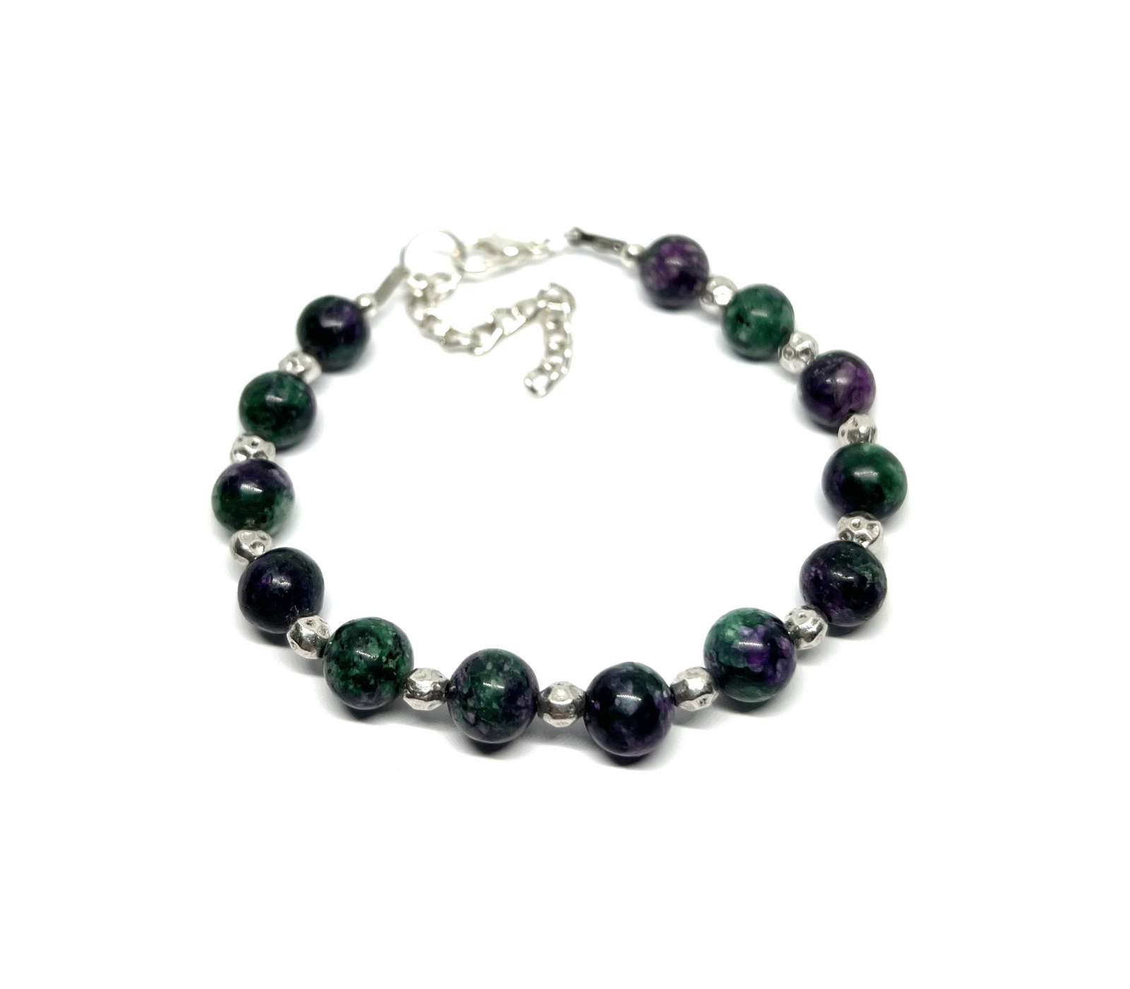 Brățara Enchanted Garden îmbină magia culorilor naturii prin pietre naturale de rubin zoisit, în nuanțe de verde intens și mov vibrant. Accentele argintii adaugă strălucire și rafinament acestei bijuterii de poveste.