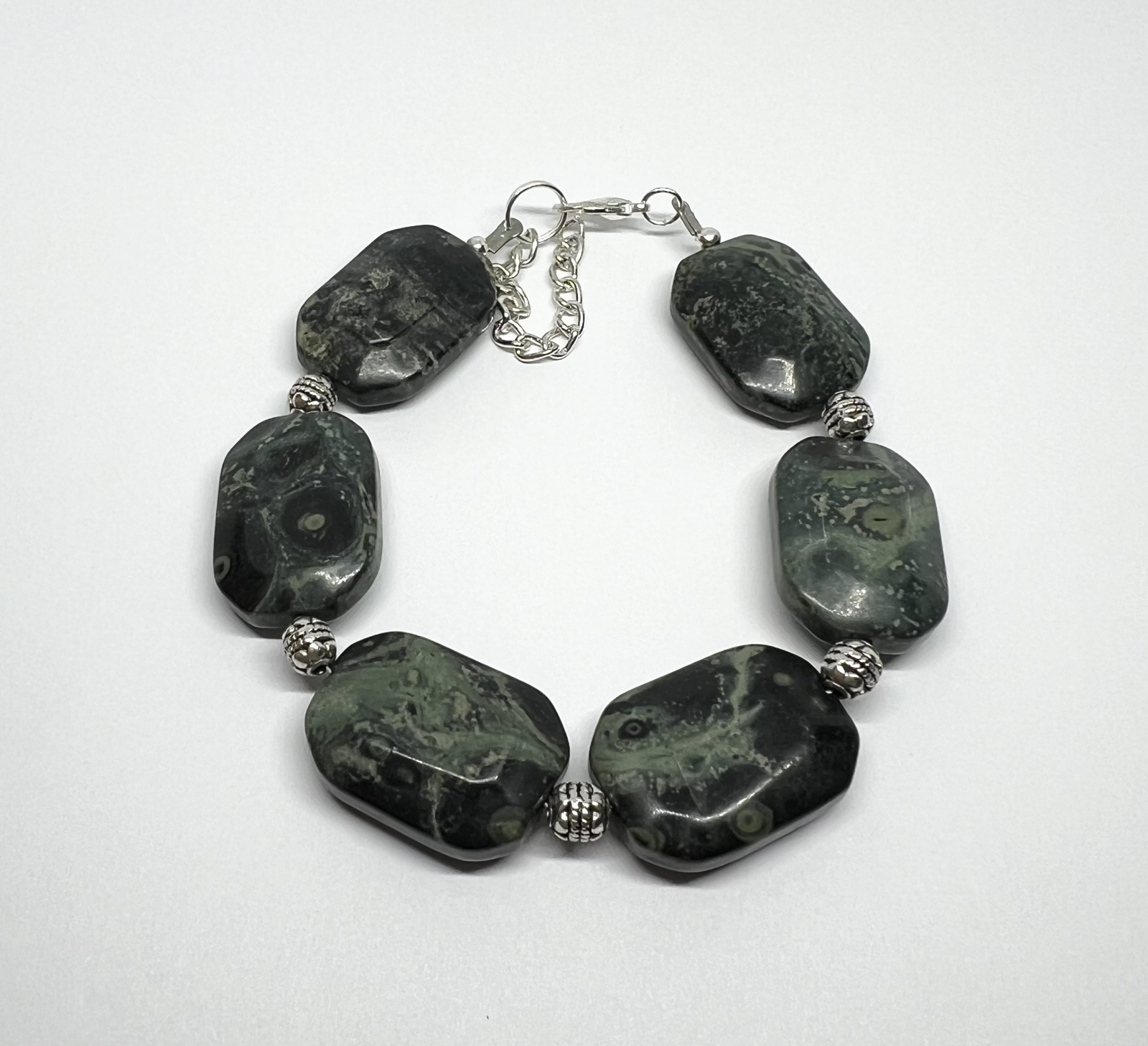 Puternică și misterioasă, brățara Jungle Spirit este realizată manual din pietre de jasp kambaba, recunoscute pentru nuanțele sale adânci de verde și negru și modelele sale naturale hipnotice. Decorată cu elemente argintii texturate, această brățară este alegerea perfectă pentru cei care iubesc natura și stilul autentic.