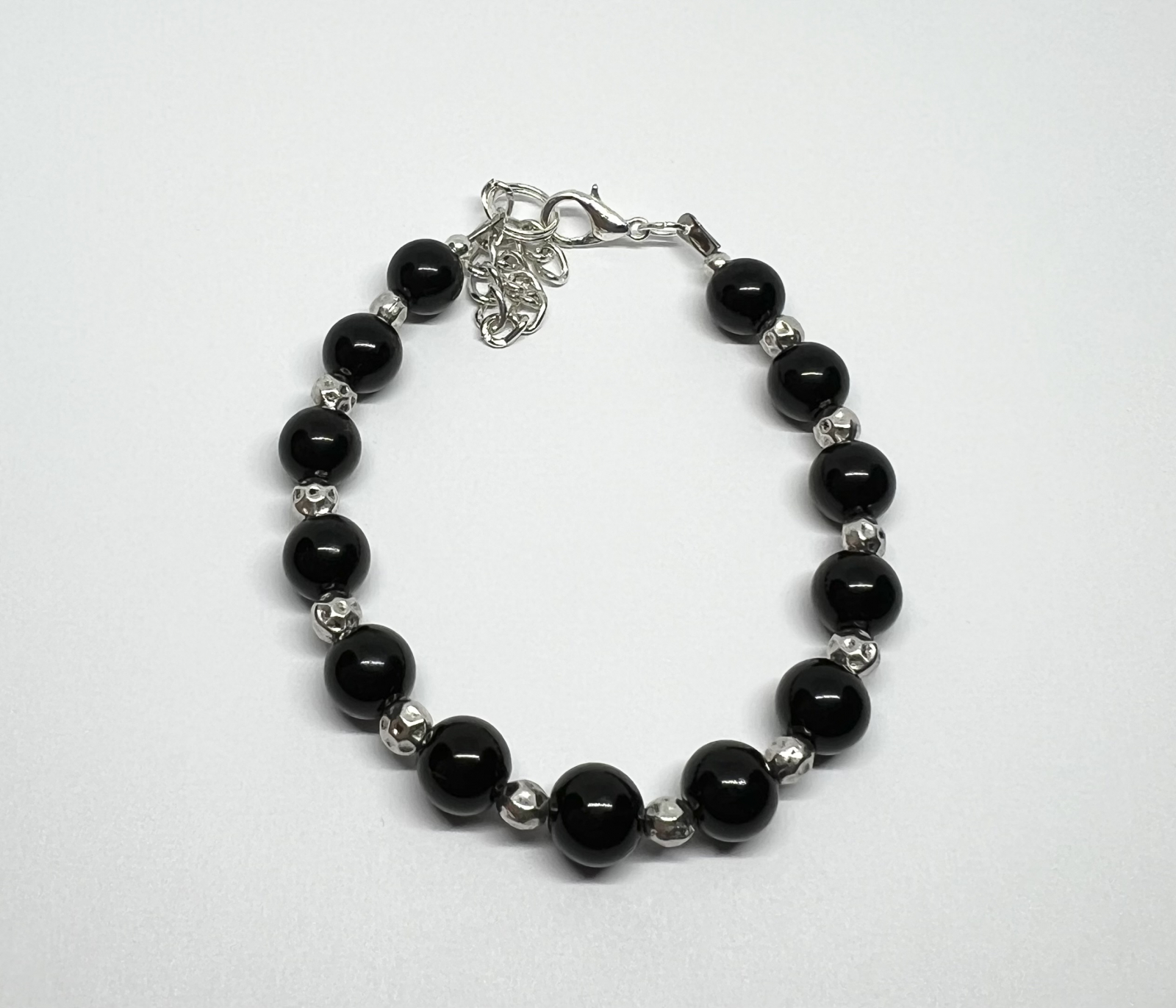 Descoperă rafinamentul pur cu brățara Midnight Elegance, creată manual din mărgele rotunde de onix natural negru. Strălucirea subtilă a pietrelor este accentuată de elementele metalice argintii cu detalii fine.O piesă versatilă, ideală pentru ocazii speciale sau pentru a adăuga un strop de lux ținutelor de zi.