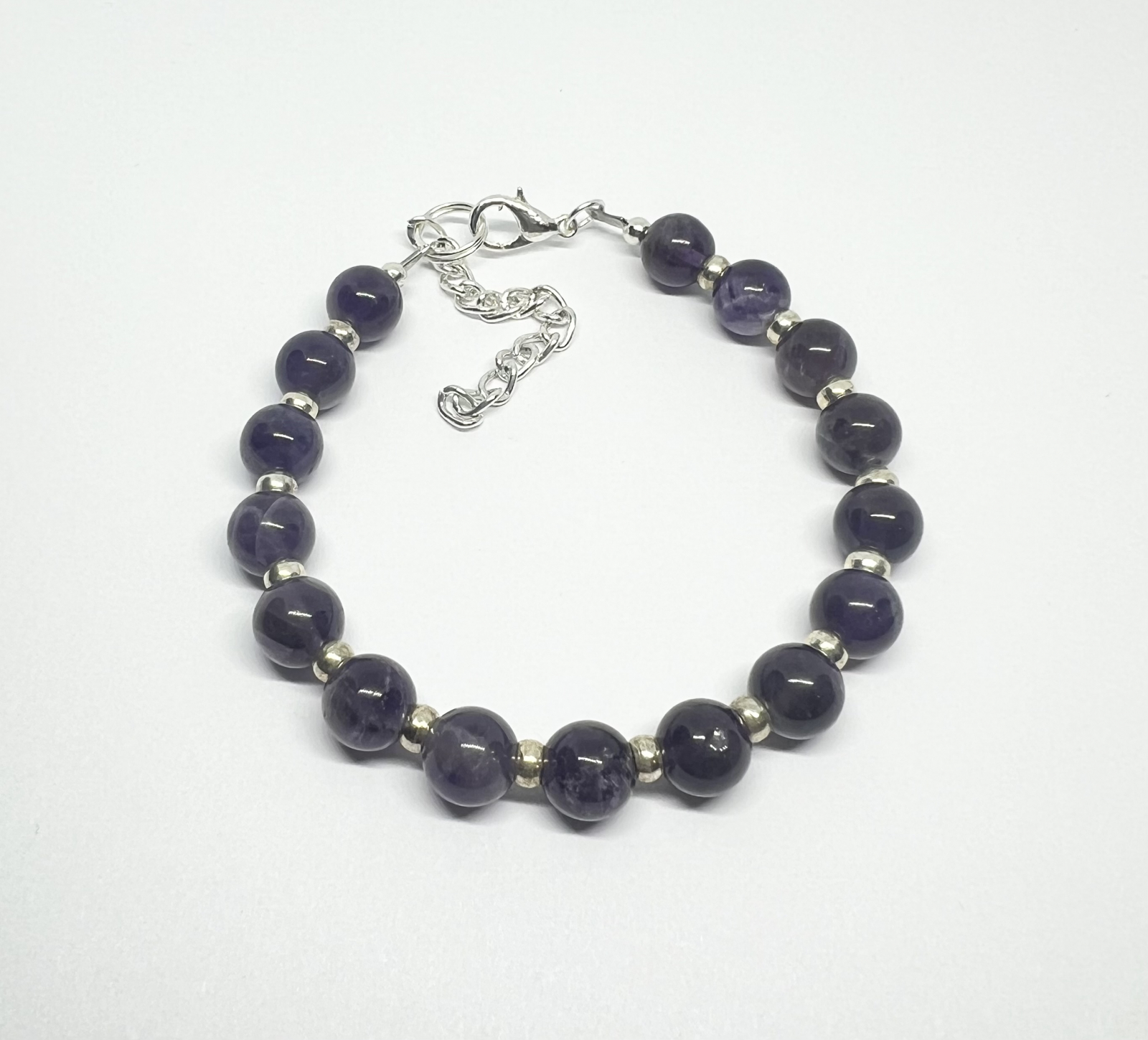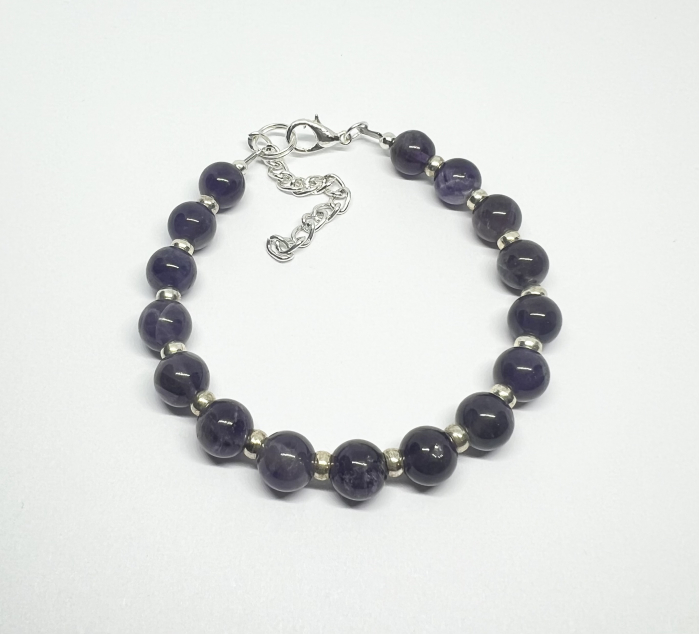 Brățara Mystic Vibes este creată din ametist natural, cunoscut pentru frumusețea și energia sa protectoare. Nuanțele intense de violet sunt puse în valoare de accentele metalice, oferind o piesă elegantă și încărcată de semnificație.