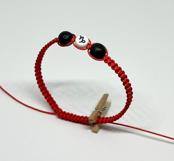 Realizată manual cu grijă, această brățară cu fir roșu și pietre vulcanice este completată de o mărgea acrilică ce poartă simbolul zodiei Capricorn (♑︎). Un simbol al ambiției, seriozității și perseverenței – calități esențiale ale Capricornului.