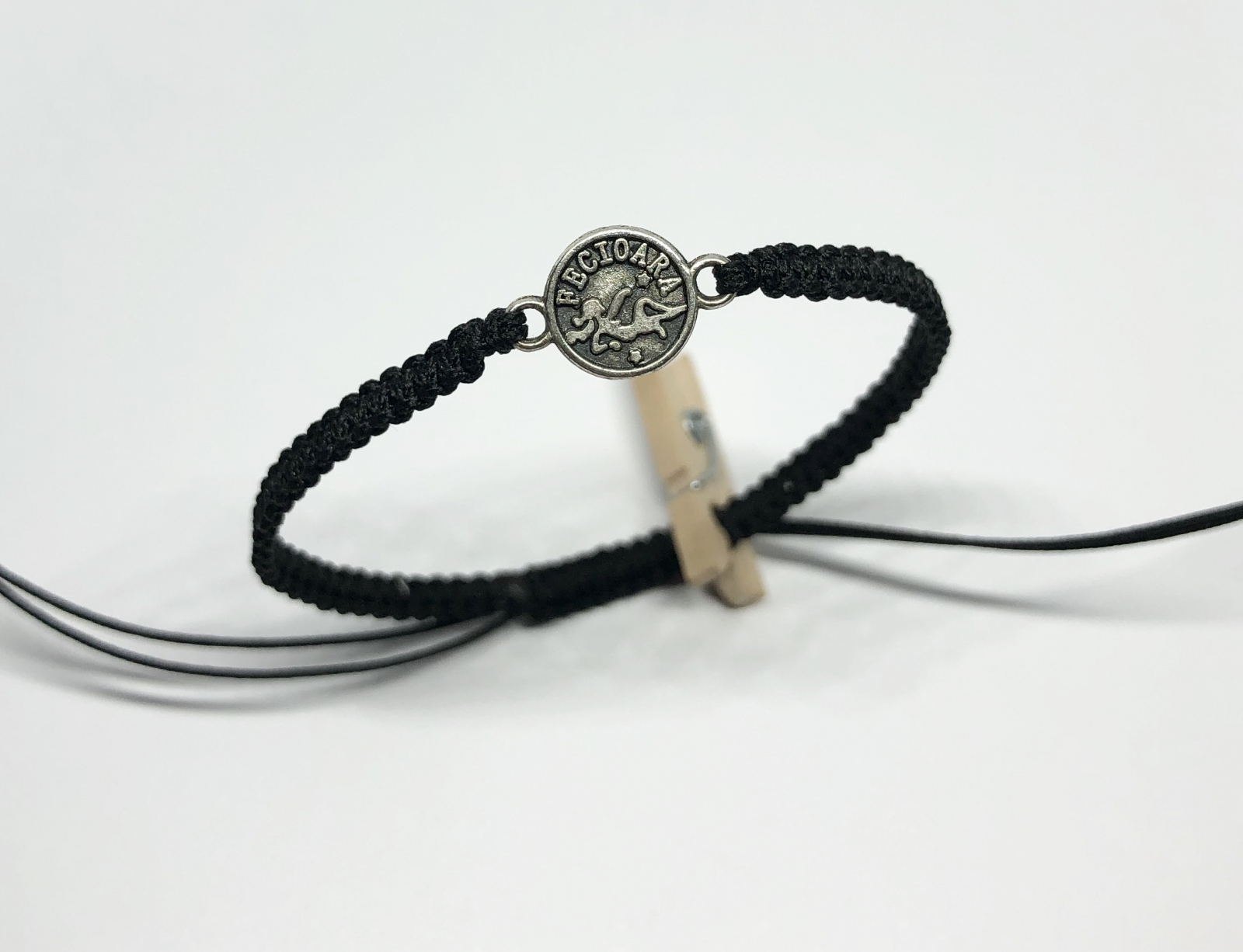 Brățară reglabilă confecționată din fir roșu si negru împletit, cu un medalion cu simbolul zodiei Fecioară.
