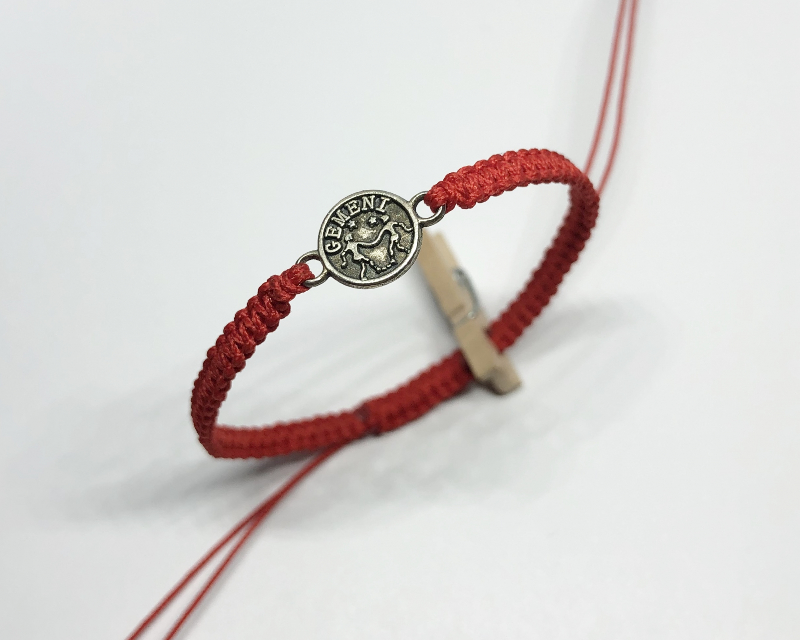 Brățară lucrată manual din fir roșu si negru împletit, având un medalion metalic cu simbolul zodiei Gemeni.