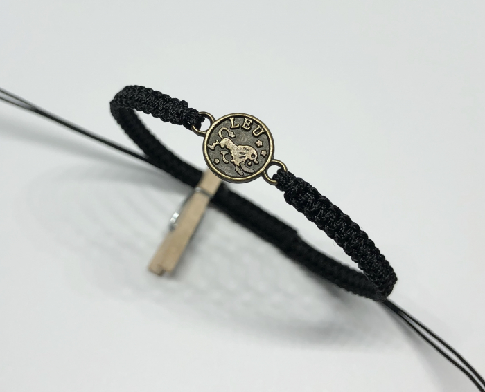 Brățară împletită manual cu fir roșu si negru și medalion metalic gravat cu simbolul zodiei Leu.