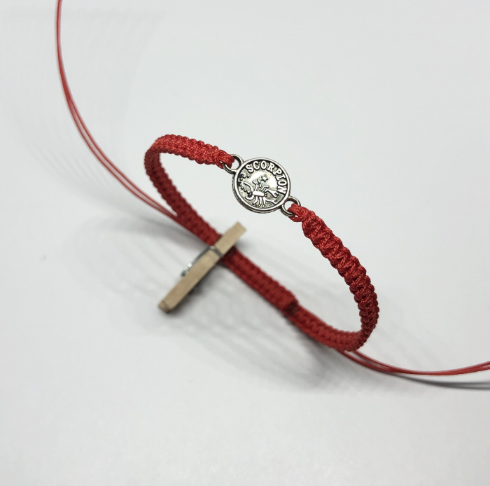Realizată cu atenție la detalii, această brățară cu șnur roșu si negru împletit și medalion cu zodia Scorpion simbolizează puterea, pasiunea și profunzimea emoțională.