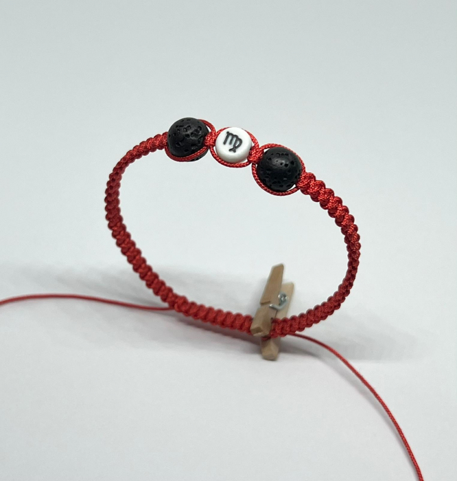 Brățară realizată manual din fir roșu cerat, decorată cu două pietre vulcanice negre și o mărgea acrilică centrală cu simbolul zodiei Fecioară (♍︎). O alegere ideală pentru cei practici, perfecționiști și dedicați, care caută eleganță în simplitate.