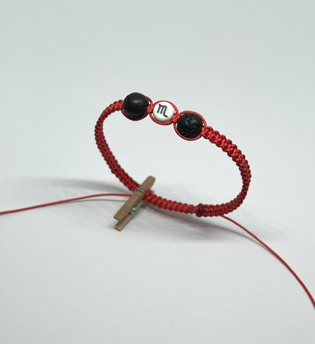Brățară împletită manual din fir roșu cerat, cu două pietre vulcanice negre și o mărgea acrilică inscripționată cu simbolul zodiei Scorpion (♏︎). Reprezintă misterul, intensitatea și loialitatea – trăsături cheie ale acestui semn de apă. Un accesoriu profund și plin de energie.