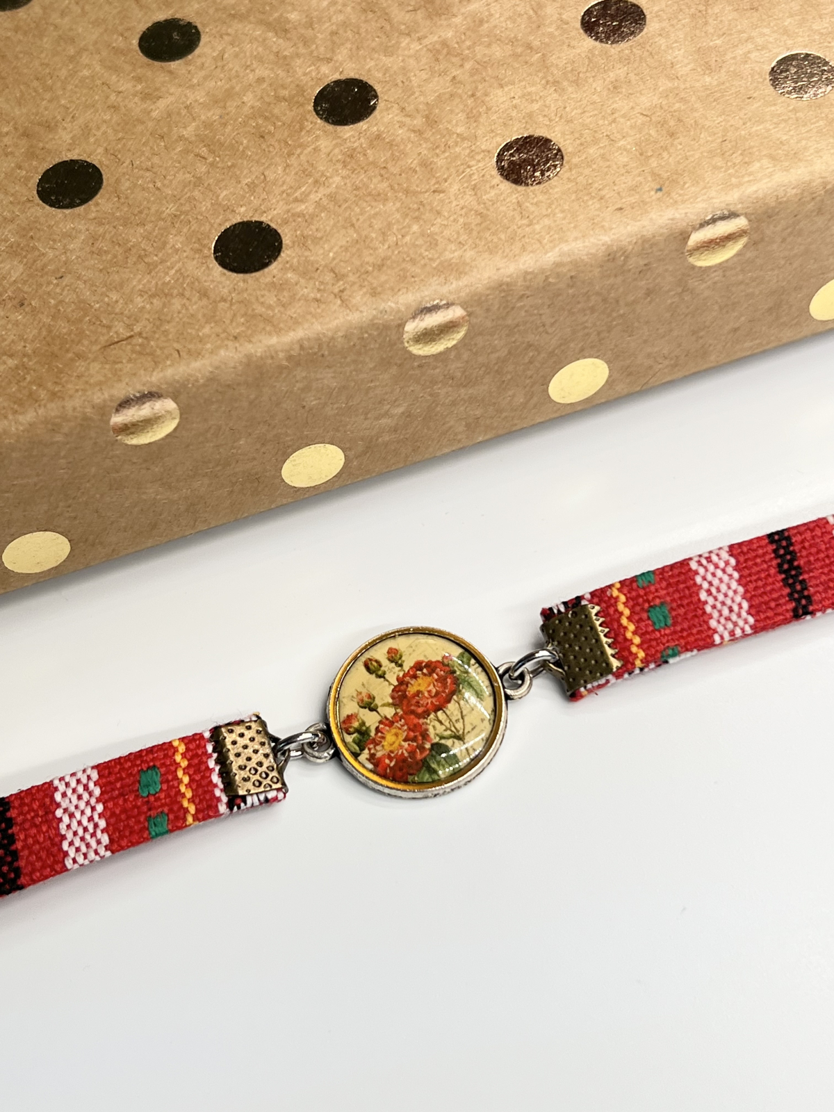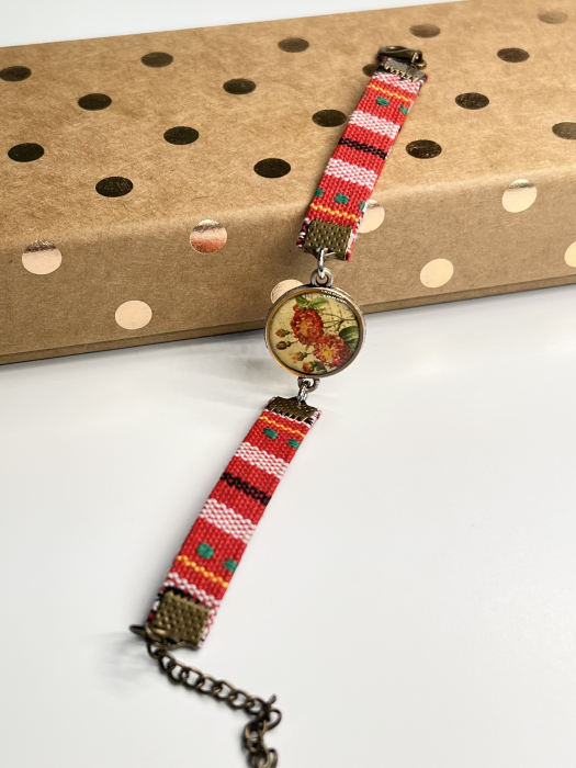 Brățări artizanale realizate din material textil cu motive colorate, inspirate din tradițiile populare. În centrul fiecărei brățări se află un link metalic decorativ cu print artistic, protejat cu rășină transparentă ce oferă un efect lucios și elegant. Combinația de texturi și culori aduce un aer autentic, vesel și plin de personalitate, făcând fiecare brățară unică — un simbol al creativității și al bucuriei de a purta artă la încheietură.