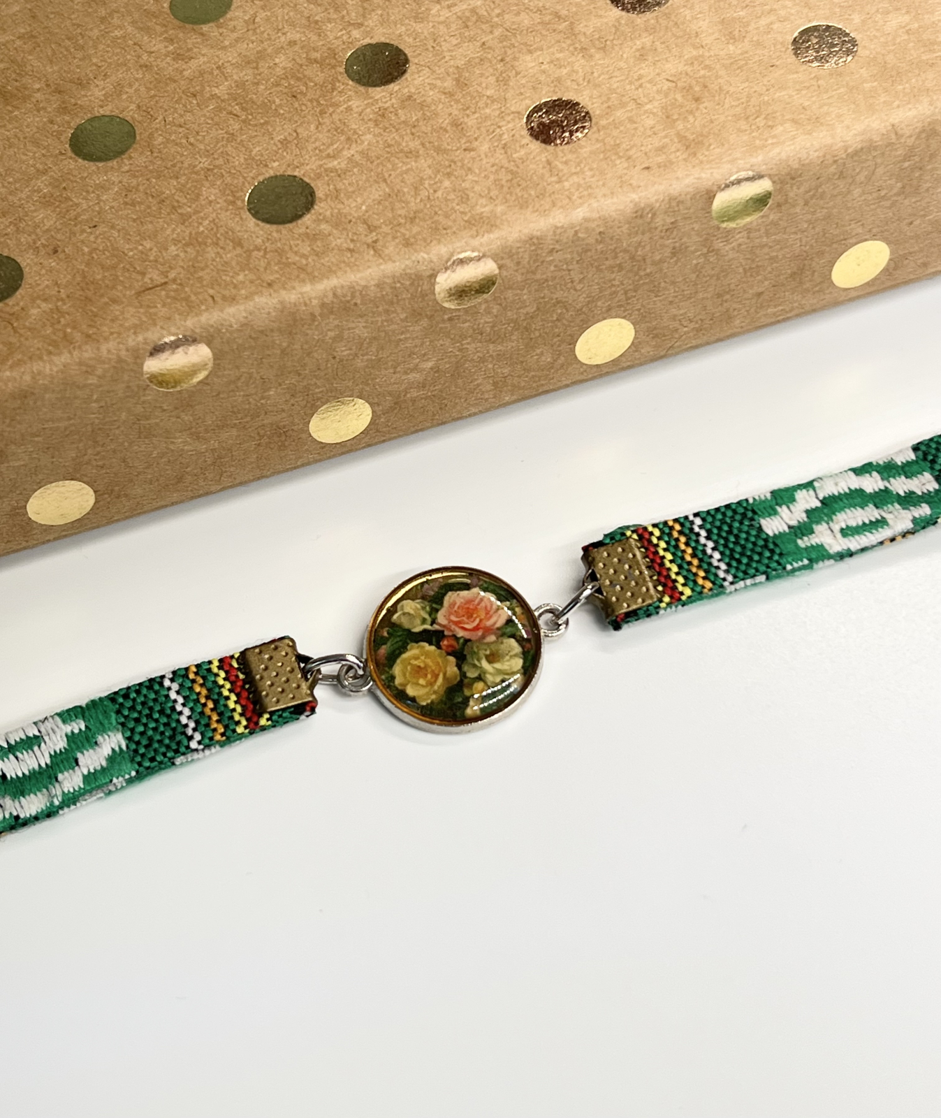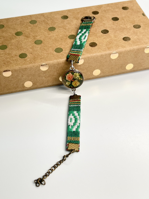 Brățări artizanale realizate din material textil cu motive colorate, inspirate din tradițiile populare. În centrul fiecărei brățări se află un link metalic decorativ cu print artistic, protejat cu rășină transparentă ce oferă un efect lucios și elegant. Combinația de texturi și culori aduce un aer autentic, vesel și plin de personalitate, făcând fiecare brățară unică — un simbol al creativității și al bucuriei de a purta artă la încheietură.