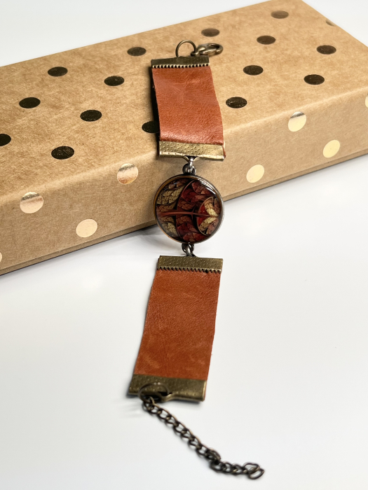 Brățări realizate manual din piele naturală, cu un design unic și detalii care spun o poveste. Fiecare piesă are în centru un link metalic decorativ cu print artistic, protejat cu rășină transparentă pentru un aspect lucios și o durabilitate crescută. Metalul cu aspect antichizat și culorile vibrante ale pielii se îmbină armonios, oferind un accesoriu elegant, potrivit atât pentru ținutele casual, cât și pentru cele cu accente tradiționale.