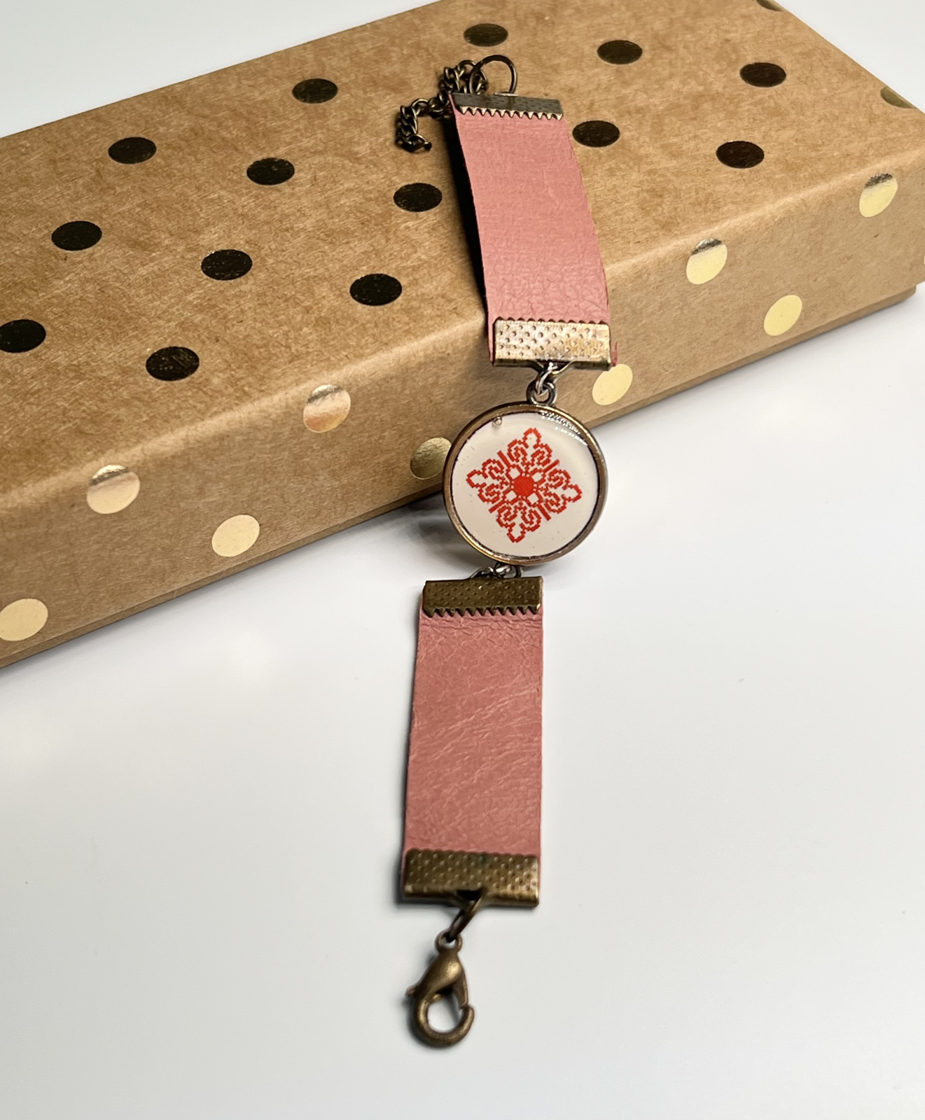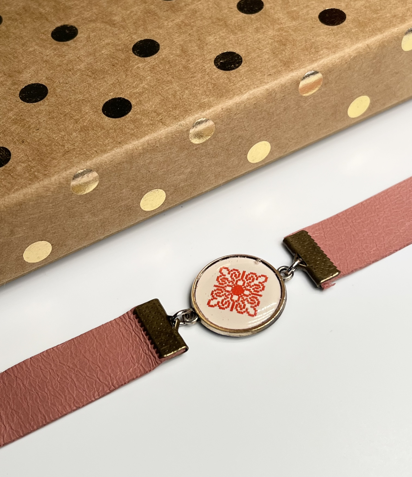 Brățări realizate manual din piele naturală, cu un design unic și detalii care spun o poveste. Fiecare piesă are în centru un link metalic decorativ cu print artistic, protejat cu rășină transparentă pentru un aspect lucios și o durabilitate crescută. Metalul cu aspect antichizat și culorile vibrante ale pielii se îmbină armonios, oferind un accesoriu elegant, potrivit atât pentru ținutele casual, cât și pentru cele cu accente tradiționale.
