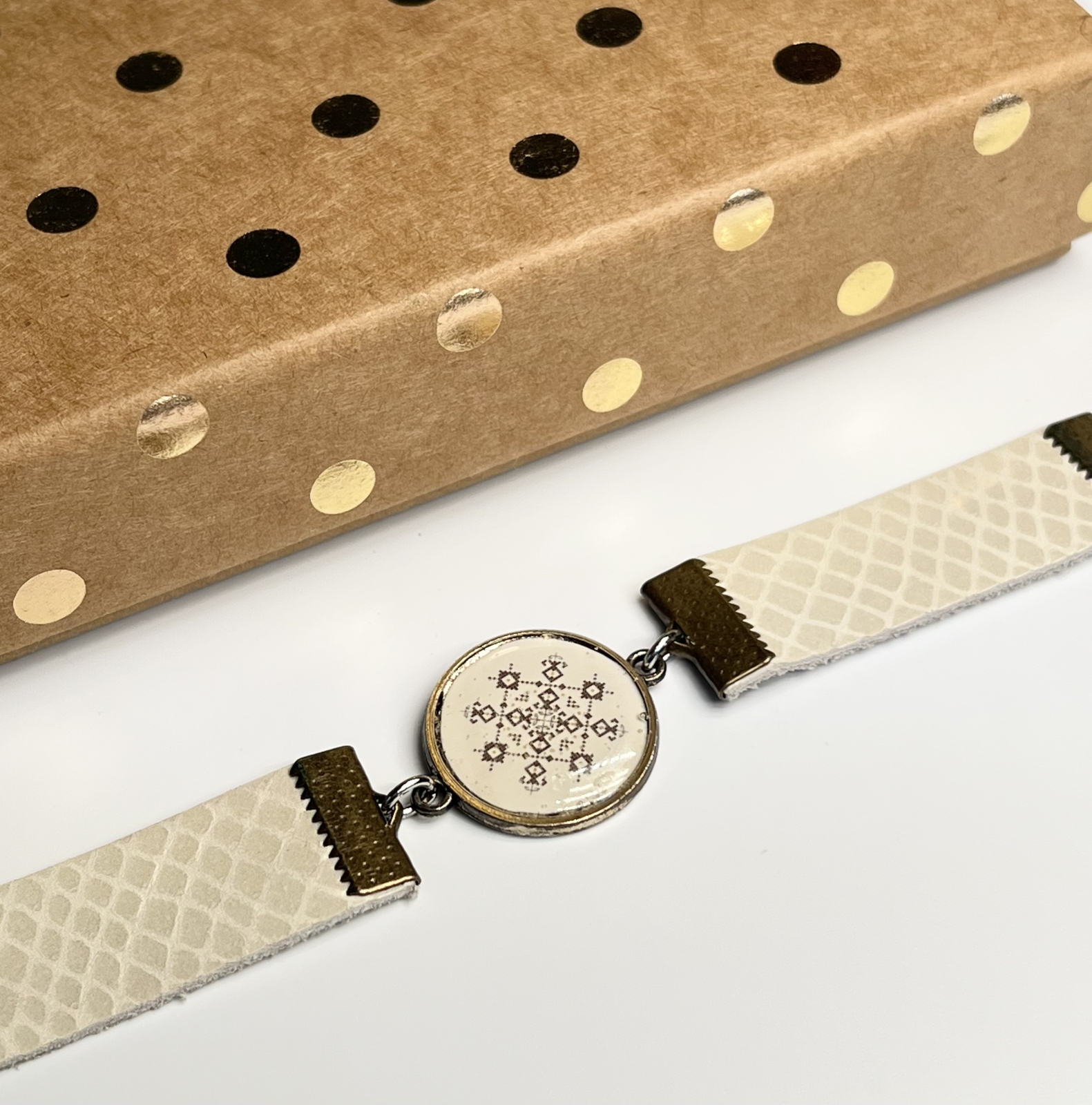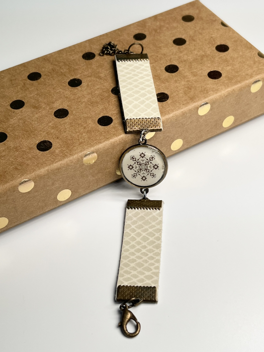 Brățări realizate manual din piele naturală, cu un design unic și detalii care spun o poveste. Fiecare piesă are în centru un link metalic decorativ cu print artistic, protejat cu rășină transparentă pentru un aspect lucios și o durabilitate crescută. Metalul cu aspect antichizat și culorile vibrante ale pielii se îmbină armonios, oferind un accesoriu elegant, potrivit atât pentru ținutele casual, cât și pentru cele cu accente tradiționale.