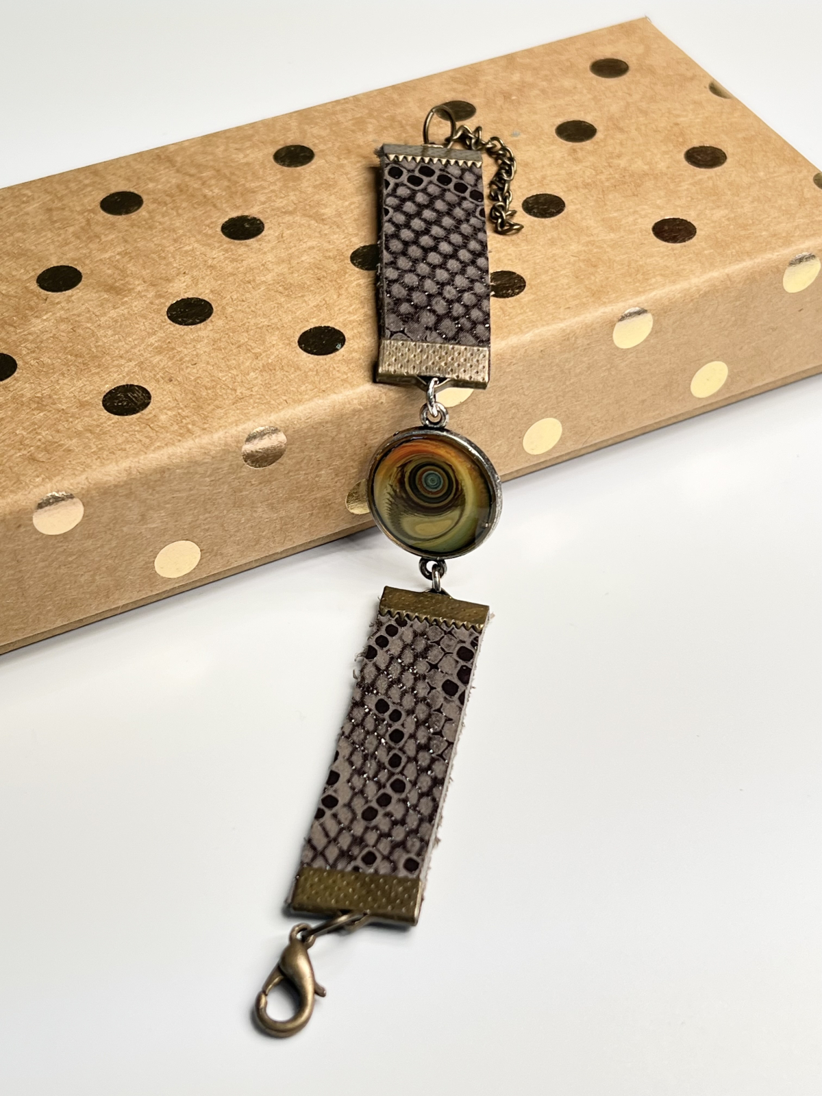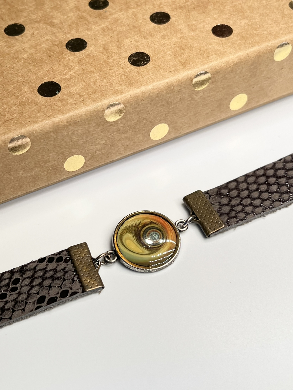 Brățări realizate manual din piele naturală, cu un design unic și detalii care spun o poveste. Fiecare piesă are în centru un link metalic decorativ cu print artistic, protejat cu rășină transparentă pentru un aspect lucios și o durabilitate crescută. Metalul cu aspect antichizat și culorile vibrante ale pielii se îmbină armonios, oferind un accesoriu elegant, potrivit atât pentru ținutele casual, cât și pentru cele cu accente tradiționale.