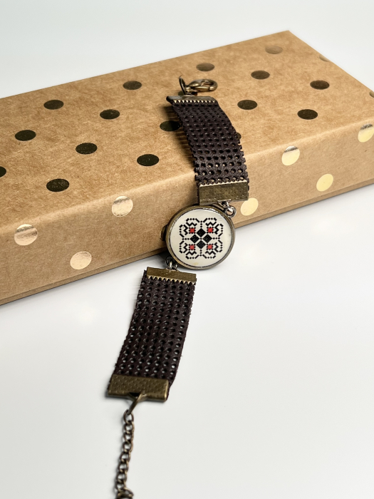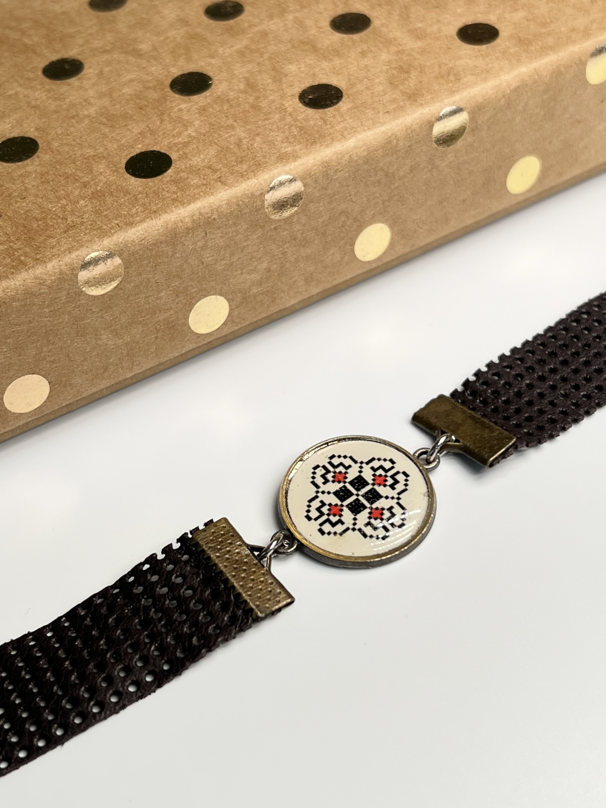 Brățări realizate manual din piele naturală, cu un design unic și detalii care spun o poveste. Fiecare piesă are în centru un link metalic decorativ cu print artistic, protejat cu rășină transparentă pentru un aspect lucios și o durabilitate crescută. Metalul cu aspect antichizat și culorile vibrante ale pielii se îmbină armonios, oferind un accesoriu elegant, potrivit atât pentru ținutele casual, cât și pentru cele cu accente tradiționale.