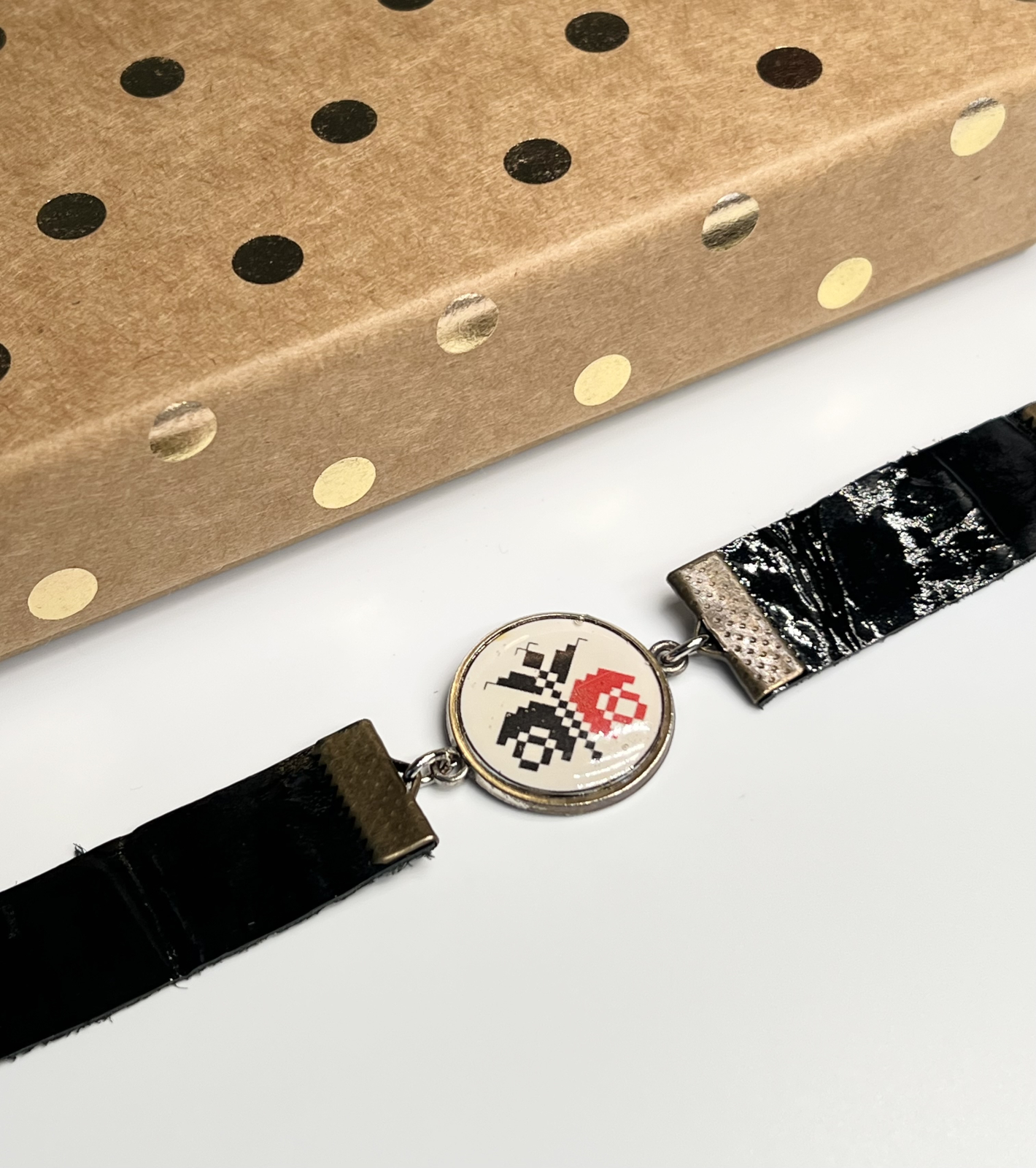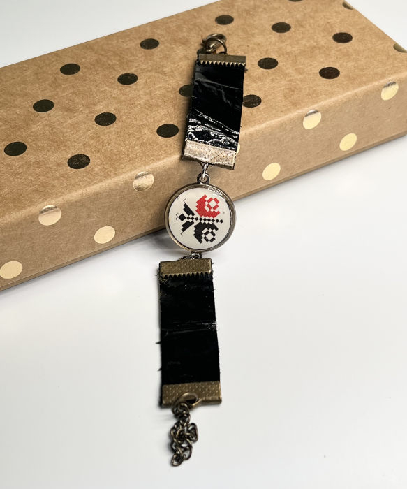 Brățări realizate manual din piele naturală, cu un design unic și detalii care spun o poveste. Fiecare piesă are în centru un link metalic decorativ cu print artistic, protejat cu rășină transparentă pentru un aspect lucios și o durabilitate crescută. Metalul cu aspect antichizat și culorile vibrante ale pielii se îmbină armonios, oferind un accesoriu elegant, potrivit atât pentru ținutele casual, cât și pentru cele cu accente tradiționale.