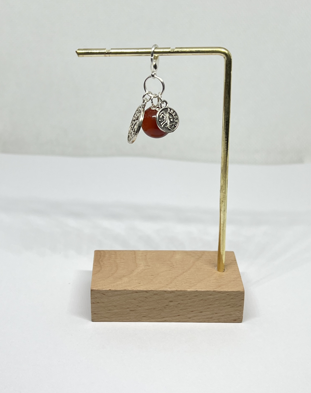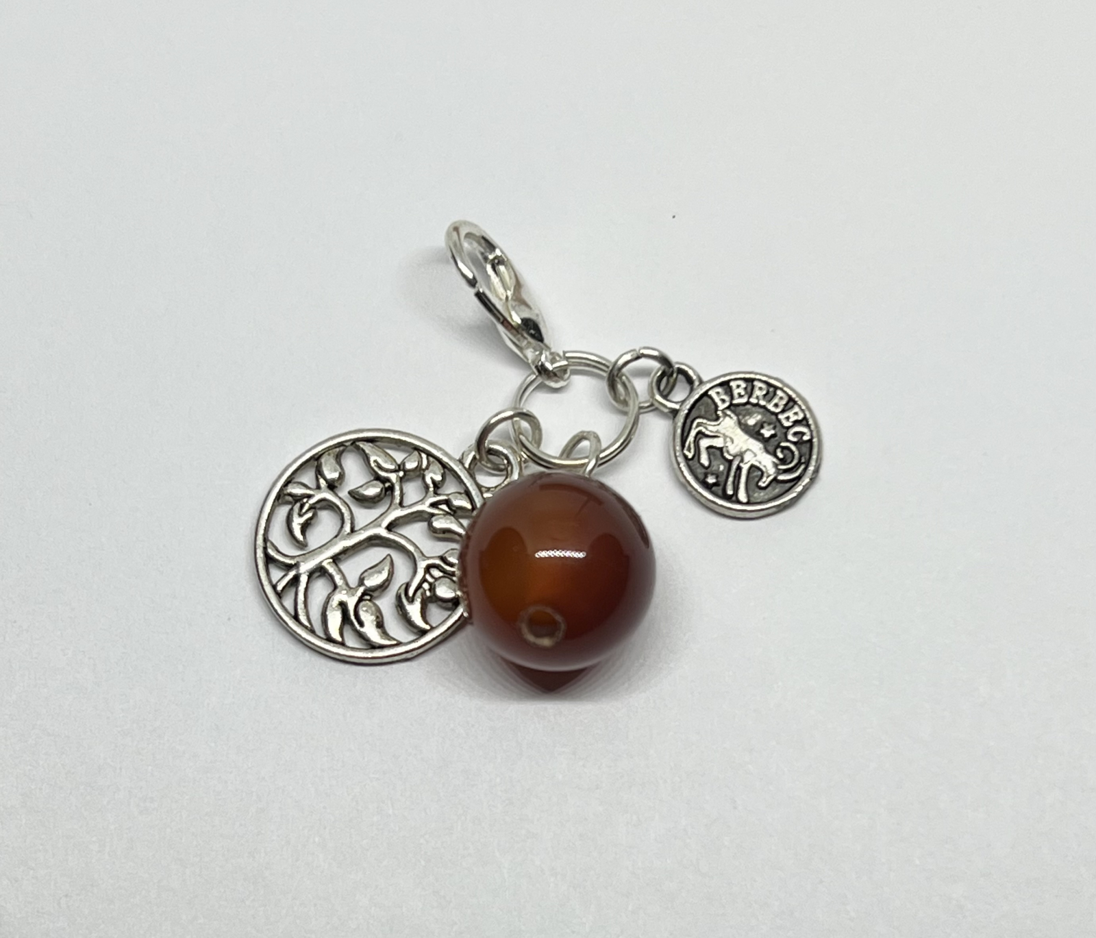 Breloc vibrant pentru zodia Berbec, decorat cu copacul vieții și o piatră de carnelian, simbol al motivației, pasiunii și curajului de a acționa.