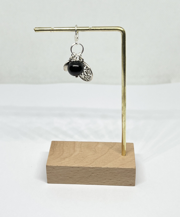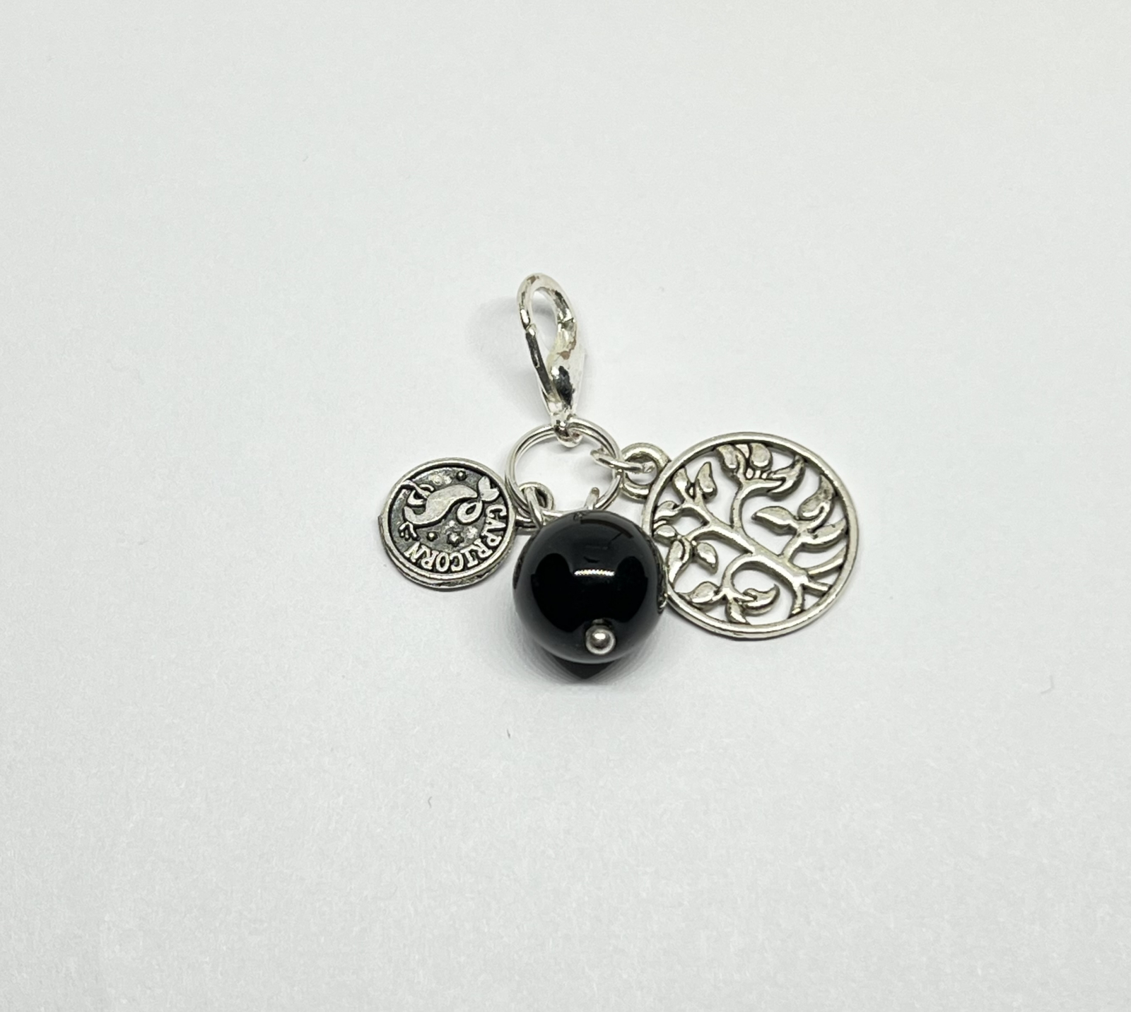 Un breloc sobru și elegant pentru zodia Capricorn, cu un simbol al copacului vieții și o bilă de onix negru, piatra protecției, forței și încrederii în sine.