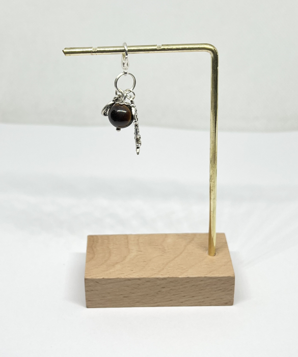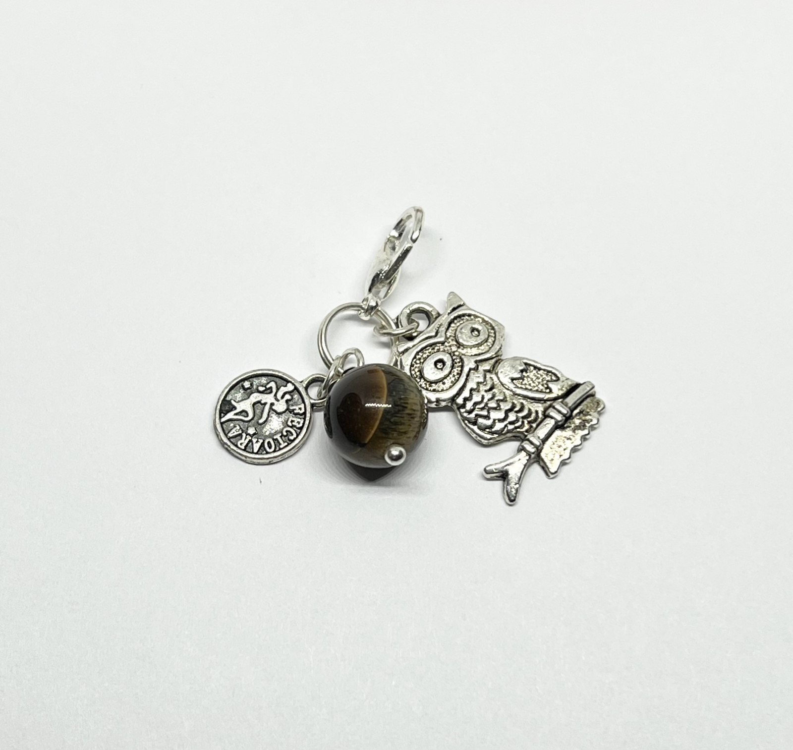 Un breloc impunător pentru zodia Leu, înfrumusețat cu o bufniță și o bilă de ochi de tigru, piatra încrederii în sine, protecției și voinței puternice.