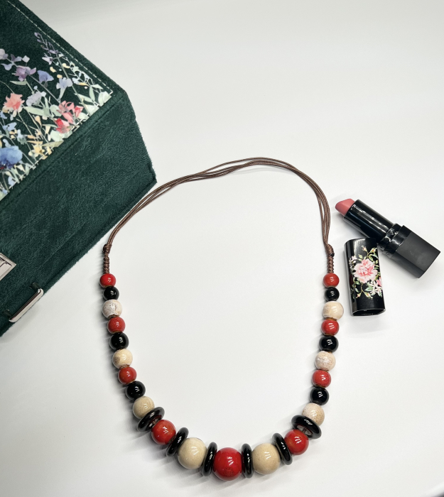 Un colier elegant și îndrăzneț, cu mărgele ceramice rotunde, crem și roșii (10–14 mm), alternate cu discuri și bile negre (6–10 mm).