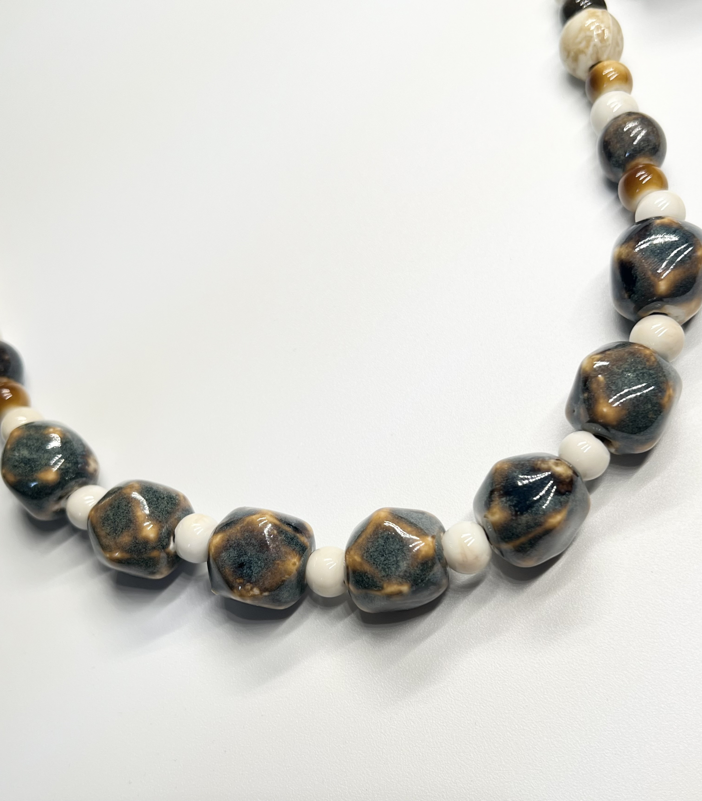 Un colier cald și echilibrat, cu mărgele ceramice în tonuri pământii (10–16 mm), alternate cu bile crem și maro (6–8 mm).