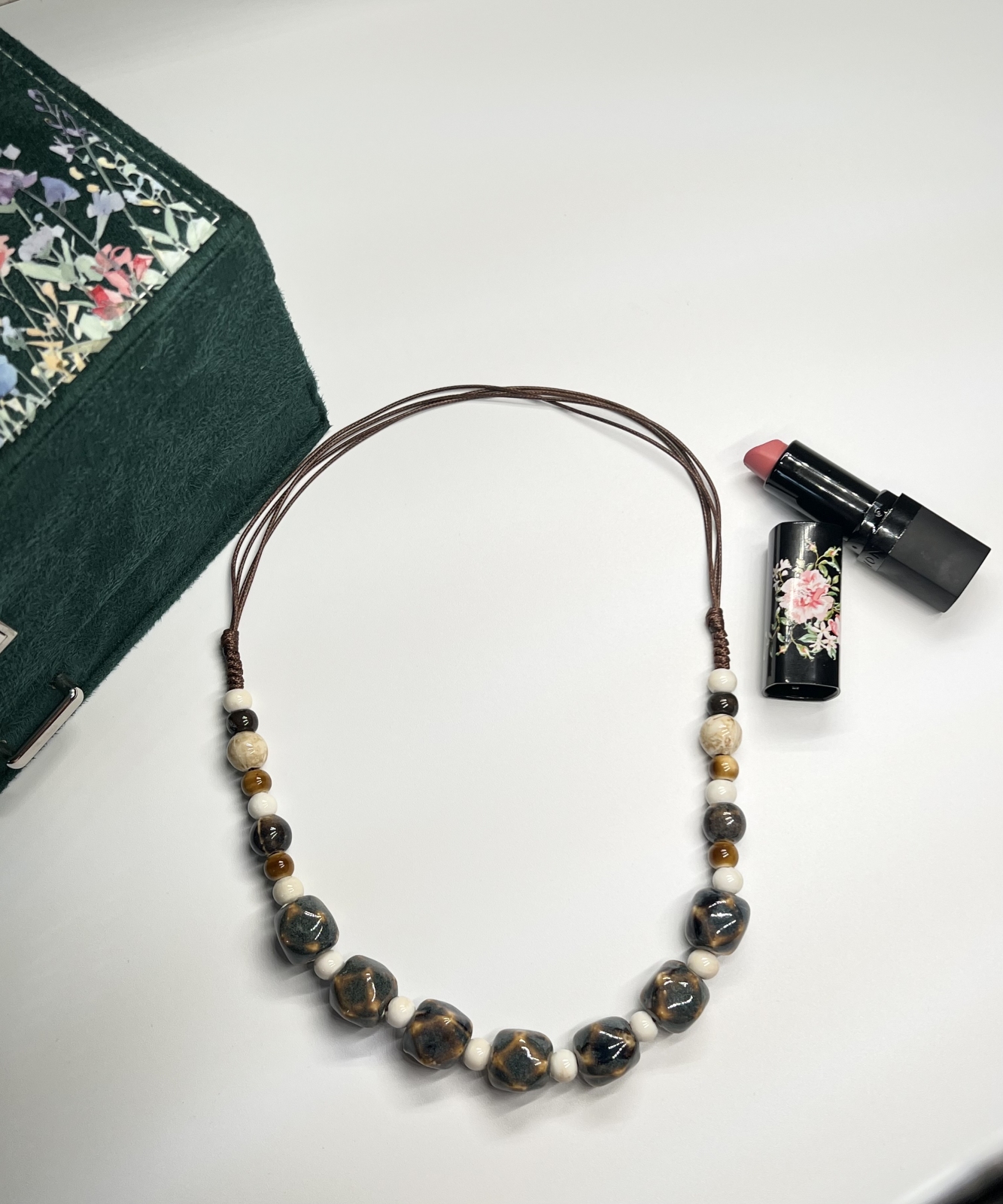 Coliere realizate manual, cu mărgele din ceramică glazurată, montate pe șnur cerat maro. Sistemul este culisabil, ceea ce permite reglarea lungimii în funcție de preferințe.