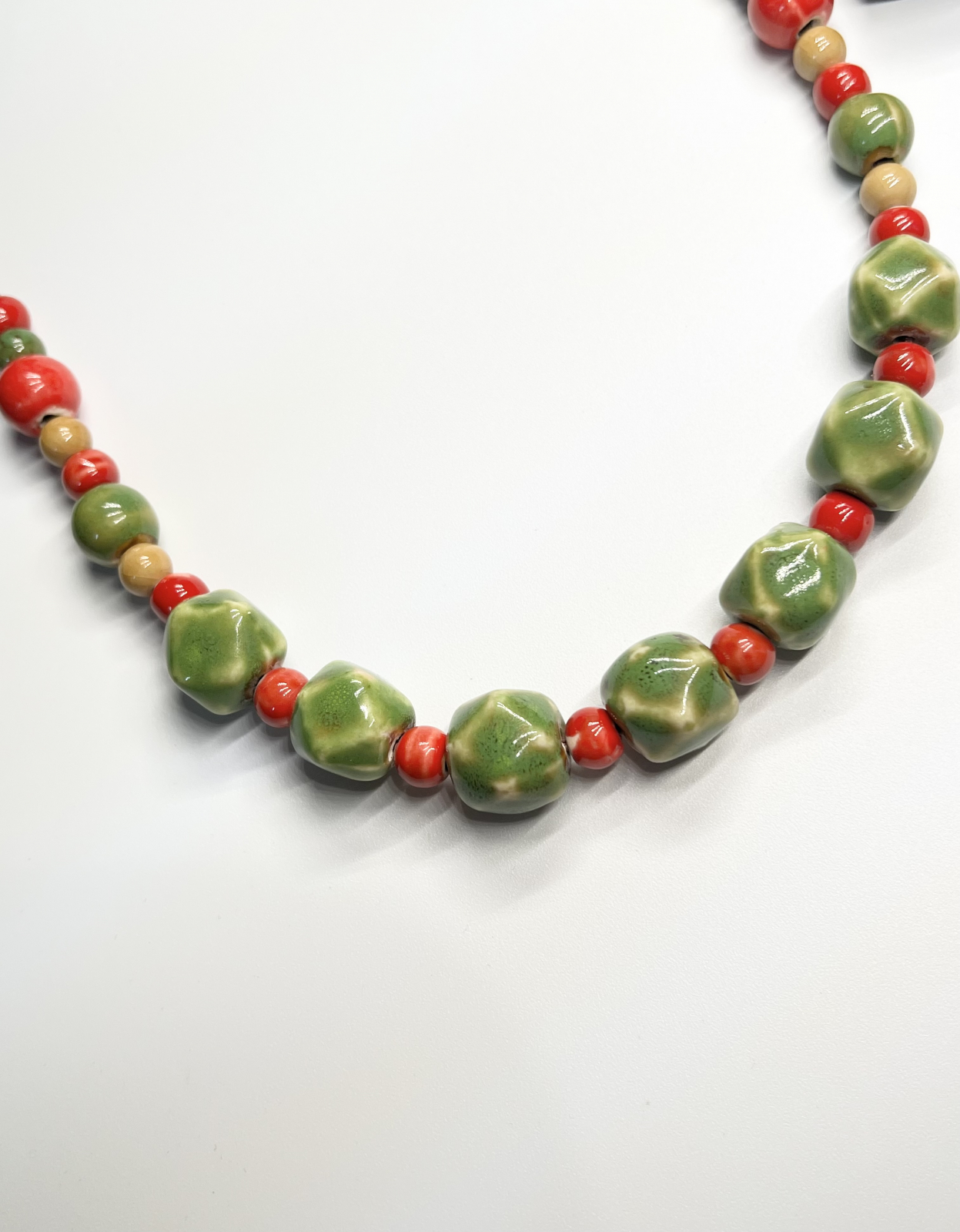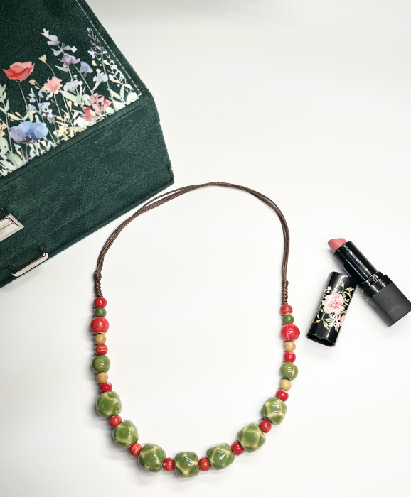 Un colier jucăuș și luminos, cu mărgele ceramice verzi (12–14 mm), alternate cu bile roșii și galbene (6–8 mm).