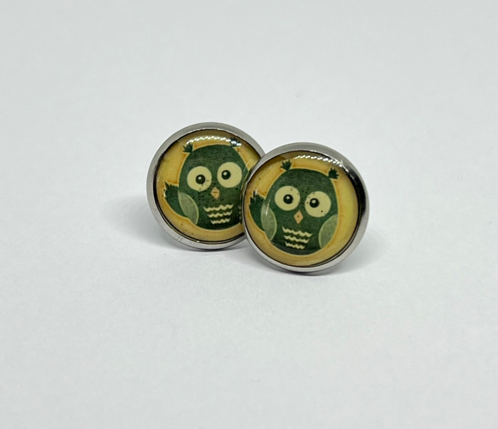 Cercei rotunzi cu bufniță stilizată în nuanțe de verde și crem, realizați din rășină pe bază din oțel inoxidabil. Un model adorabil, care adaugă un aer vesel și prietenos ținutelor de zi cu zi.