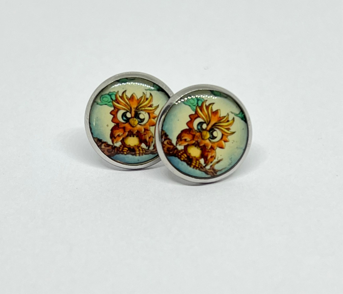 Cercei cu bufniță ilustrată în nuanțe calde de portocaliu și galben, protejată sub un strat lucios de rășină, pe bază din oțel inoxidabil. Un design vesel și expresiv, ideal pentru cei care adoră accesoriile cu personalitate.