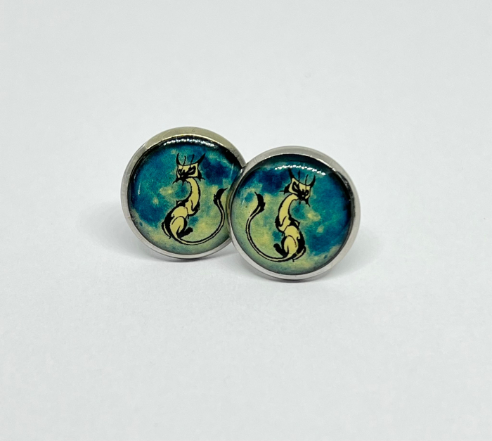 Cercei rotunzi cu pisică albă stilizată, pe fundal albastru-verzui, realizați manual din rășină pe bază din oțel inoxidabil. Un design elegant și misterios, perfect pentru iubitorii de pisici și detalii artistice.