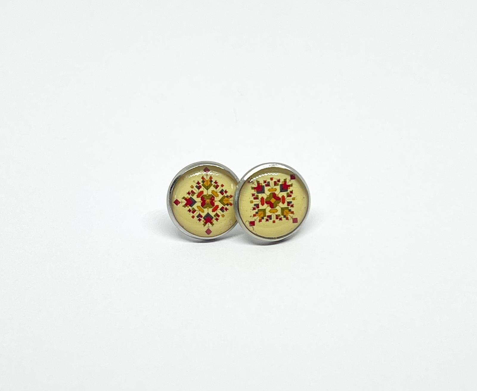Cercei rotunzi cu model geometric tradițional, în nuanțe calde de roșu și galben pe fundal crem. Simbol al echilibrului și armoniei, acești cercei din rășină pe bază din oțel inoxidabil completează perfect o ținută casual sau elegantă.