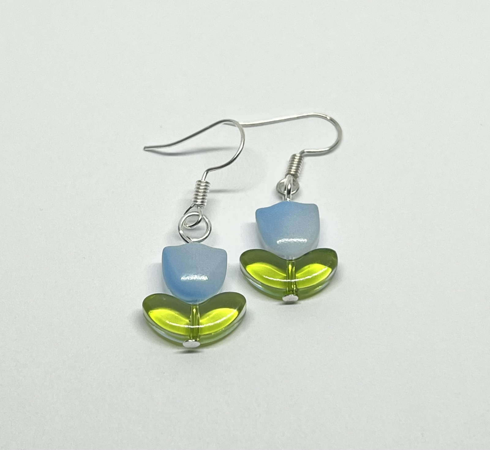 Cercei rafinați în formă de lalea albastră, realizați manual din sticlă de calitate, cu reflexii delicate și frunzulițe verzi translucide. Designul minimalist și jocul de culori pastelate oferă un aer proaspăt și elegant, potrivit pentru orice ocazie.