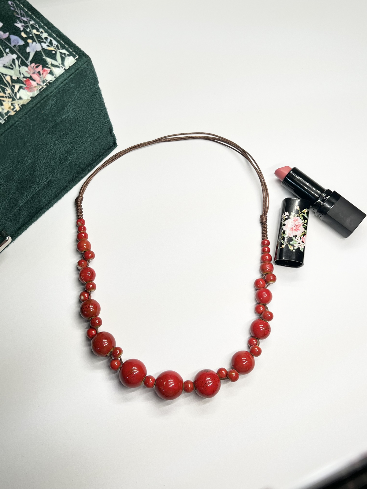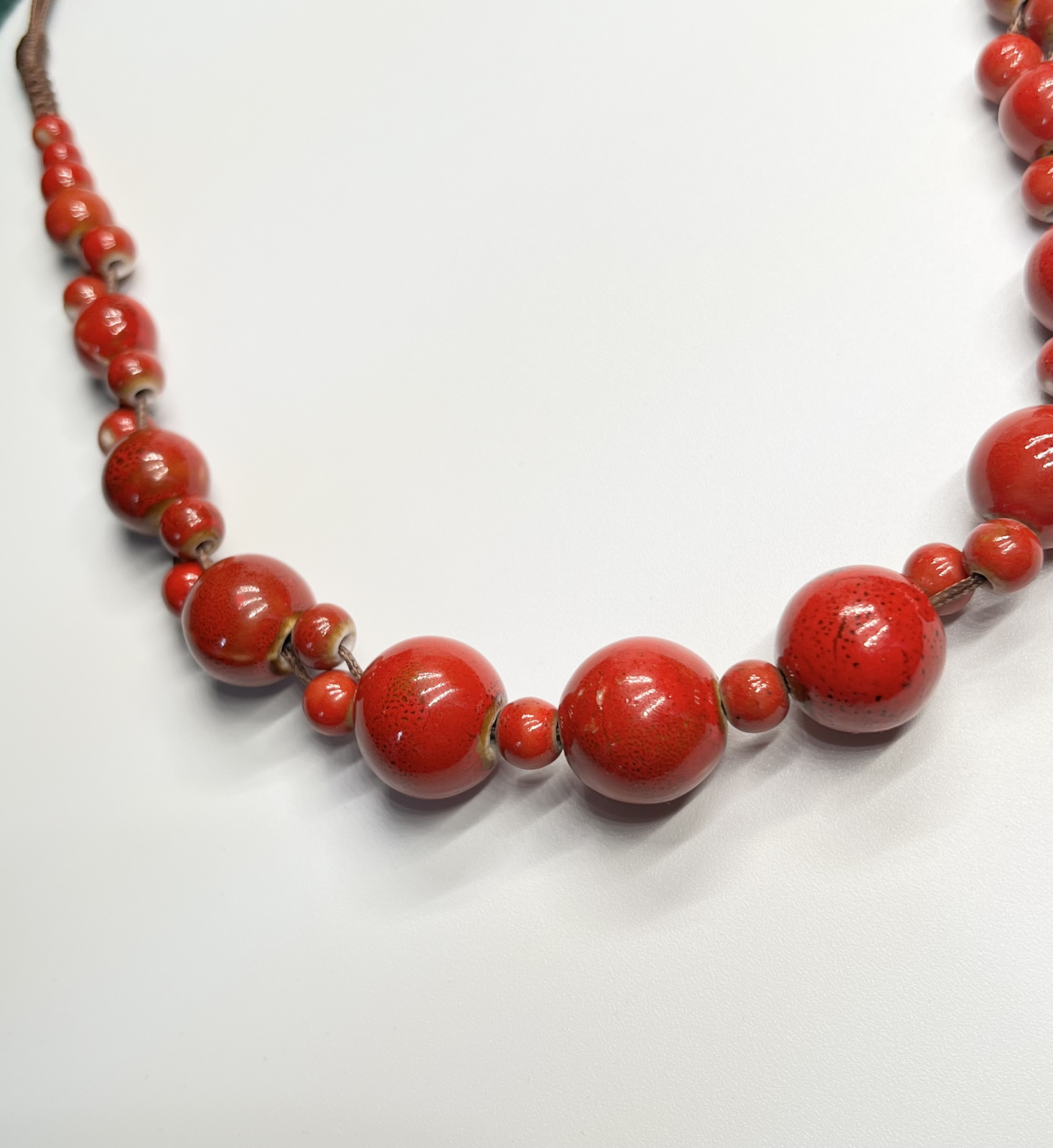 Un colier pasional și îndrăzneț, cu mărgele ceramice rotunde, roșii (8–16 mm), alternate cu bile mici roșii (6 mm).