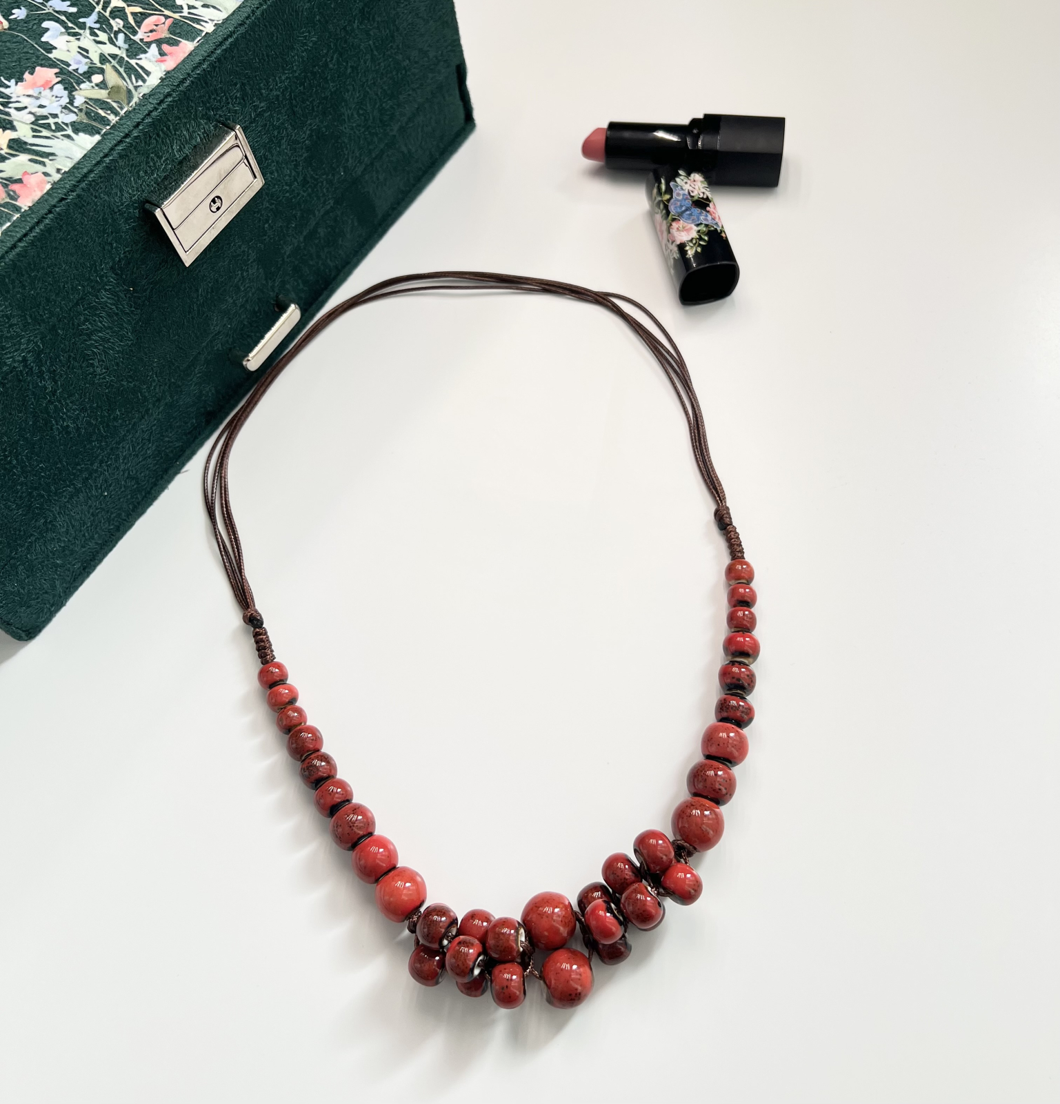 Un colier îndrăzneț și pasional, cu mărgele ceramice roșii (12–14 mm) și discuri ceramice negre, completat de bile mai mici în nuanțe închise (6–8 mm).