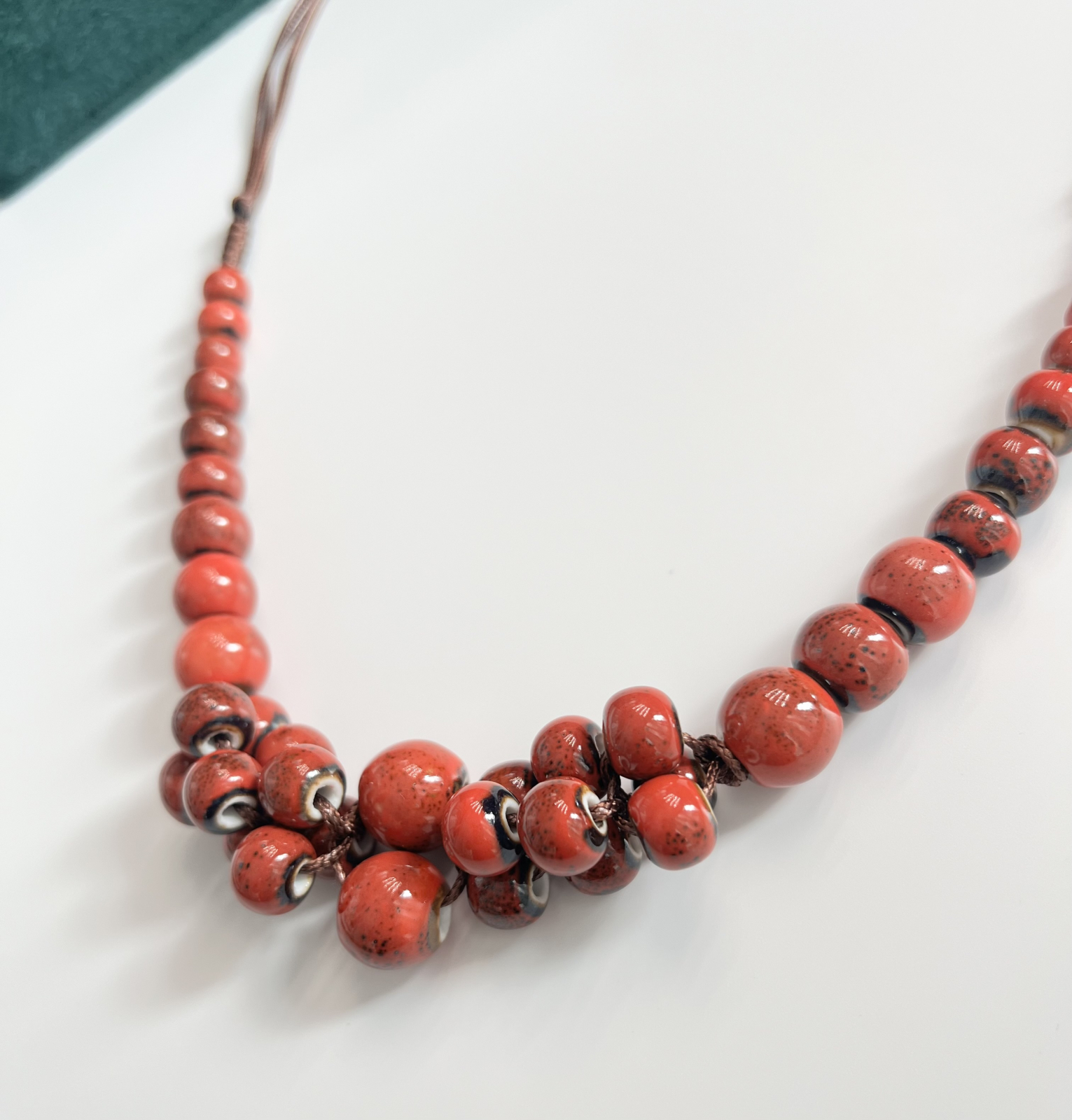 Coliere realizate manual, cu mărgele din ceramică glazurată, montate pe șnur cerat maro. Sistemul este culisabil, ceea ce permite reglarea lungimii în funcție de preferințe.