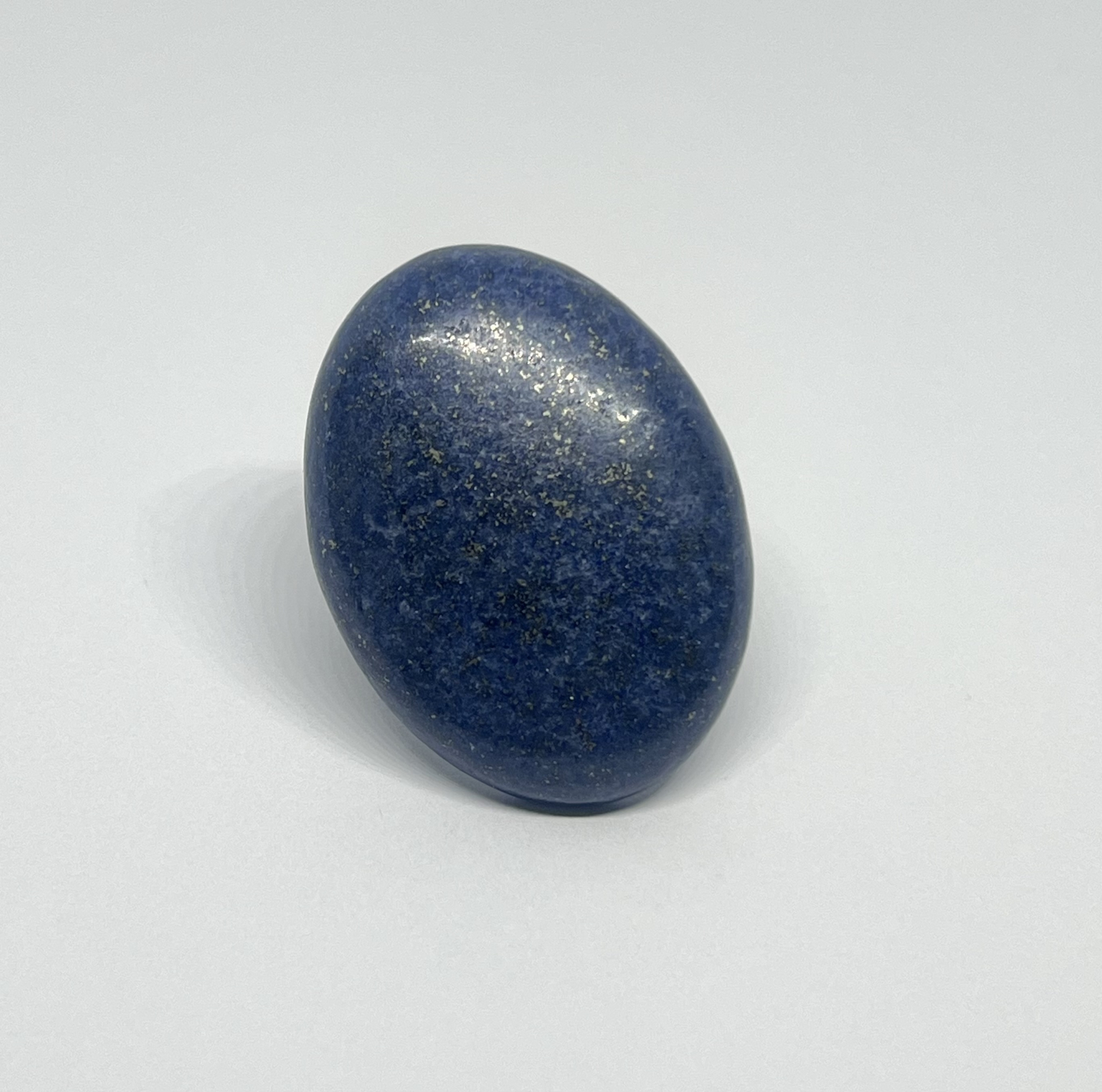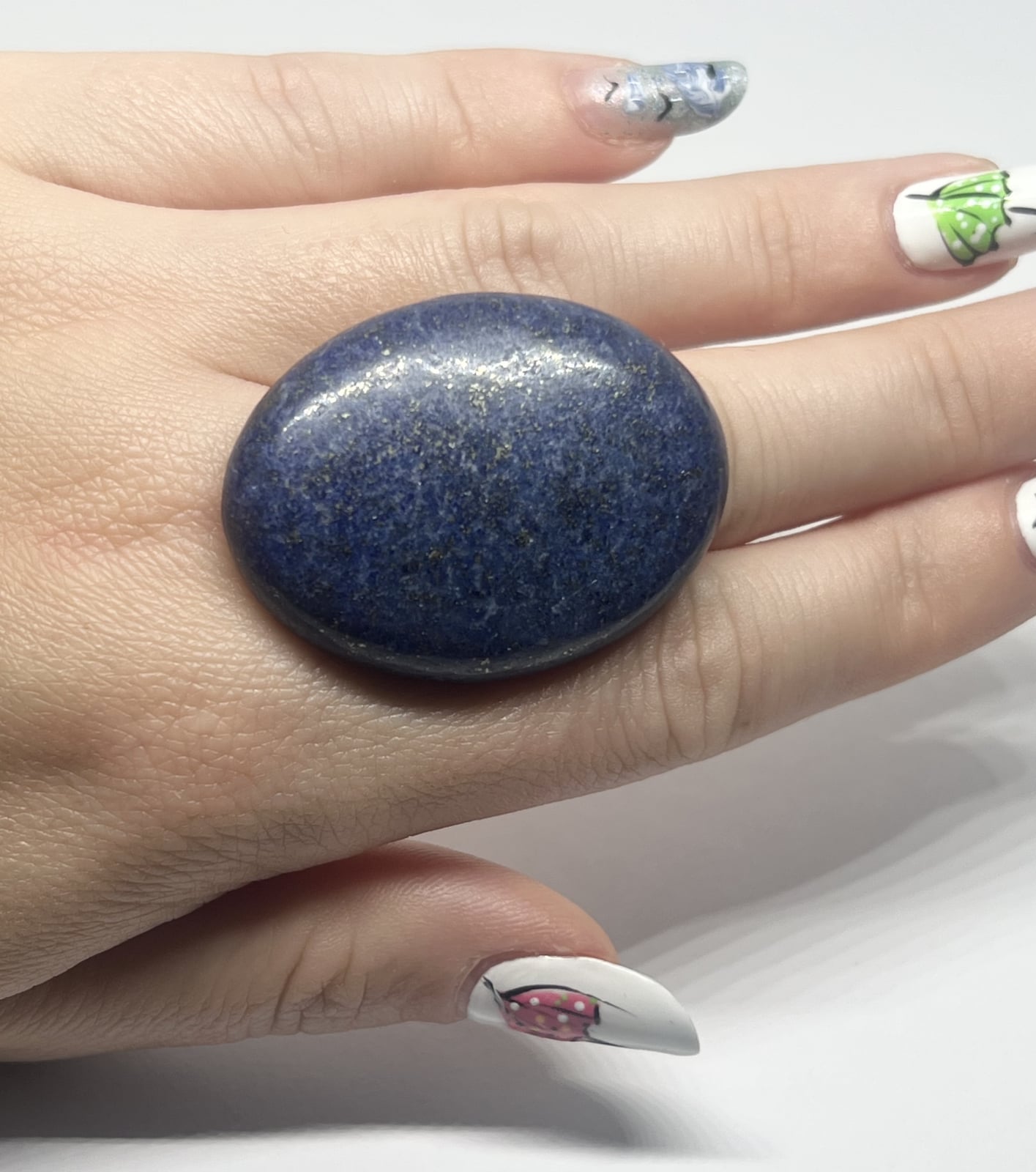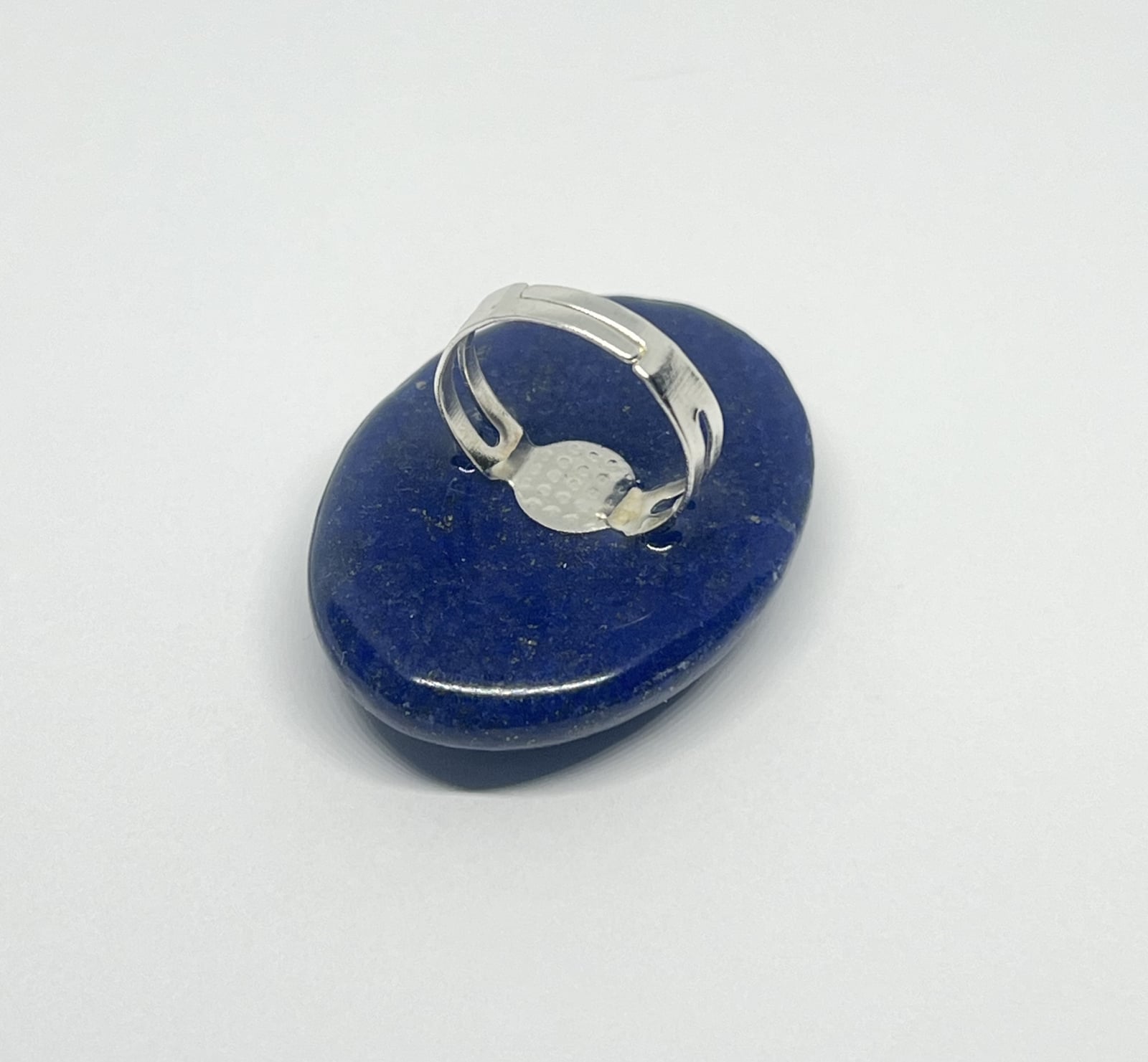 Inel realizat manual, cu piatră semiprețioasă de lapis lazuli în nuanțe profunde de albastru regal, presărată cu reflexii aurii naturale. Piatra este montată pe o bază reglabilă argintie, fixată cu rășină transparentă pentru o rezistență sporită și un finisaj elegant.