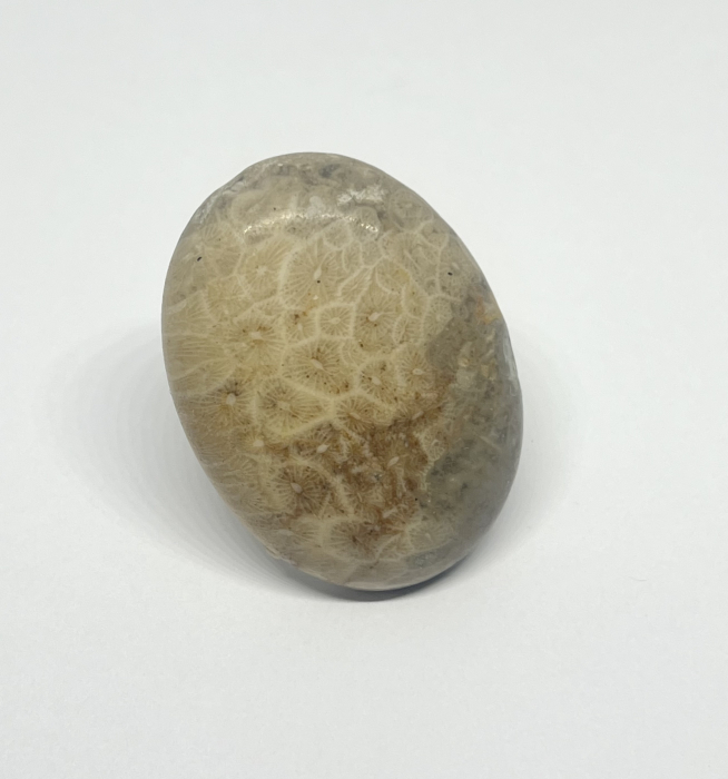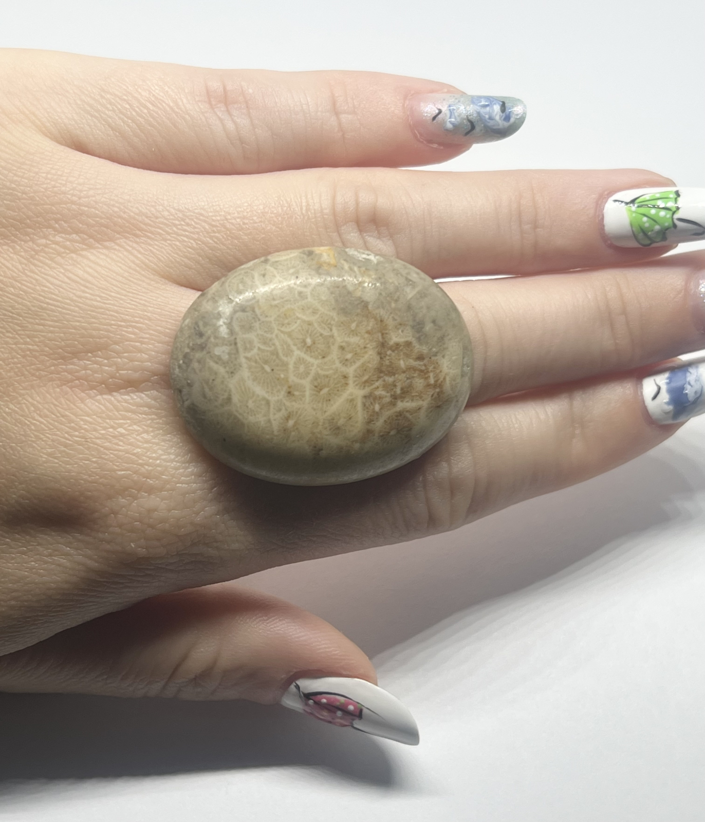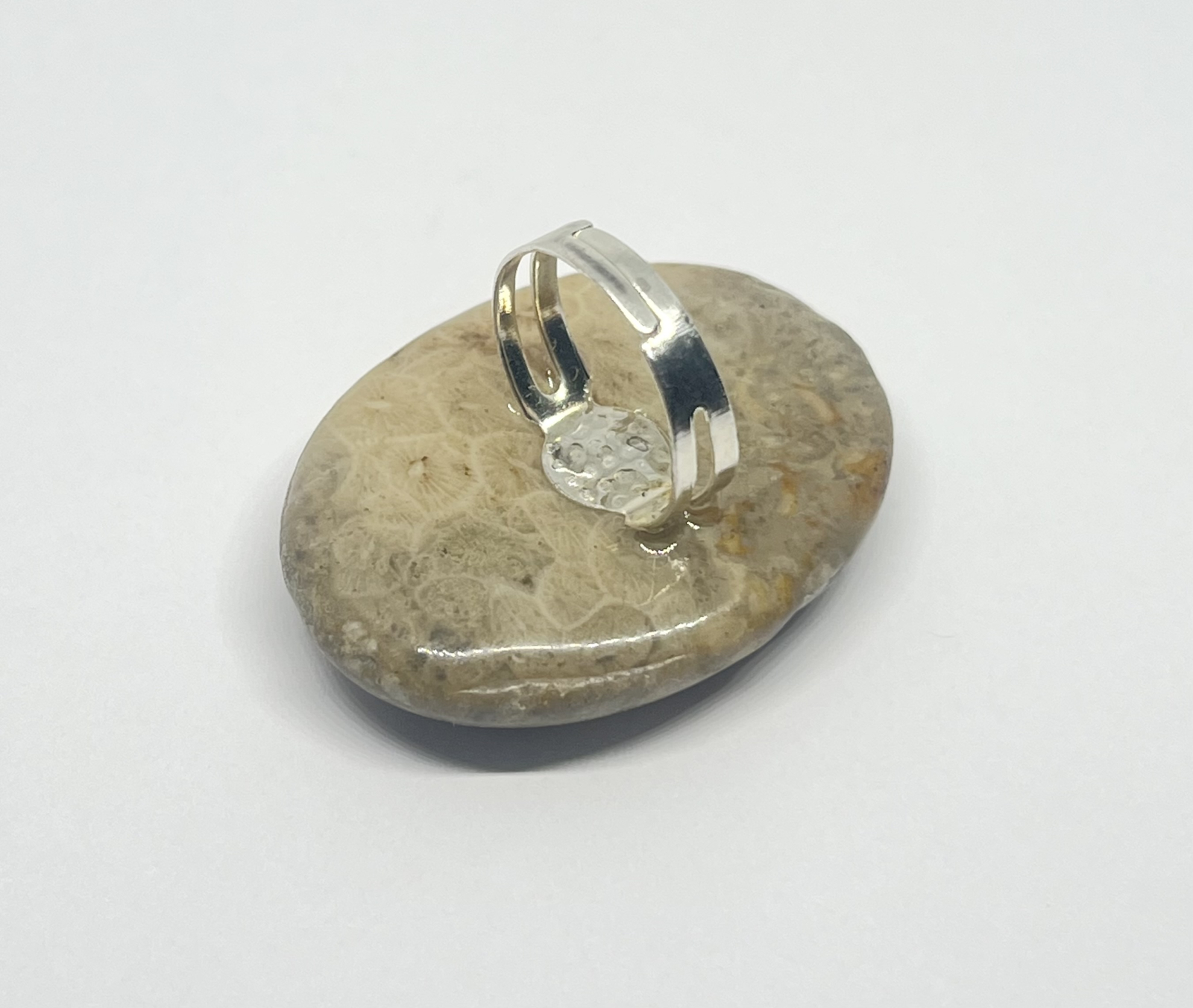 Inel realizat manual, cu piatră semiprețioasă de coral fosil, în nuanțe calde de bej și crem, cu modele florale naturale formate de corali preistorici. Fiecare piesă este unică, purtând în ea amintirea oceanului primordial. Baza argintie reglabilă este fixată cu rășină transparentă, pentru o prindere sigură și un luciu delicat.