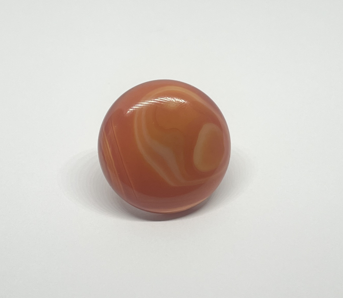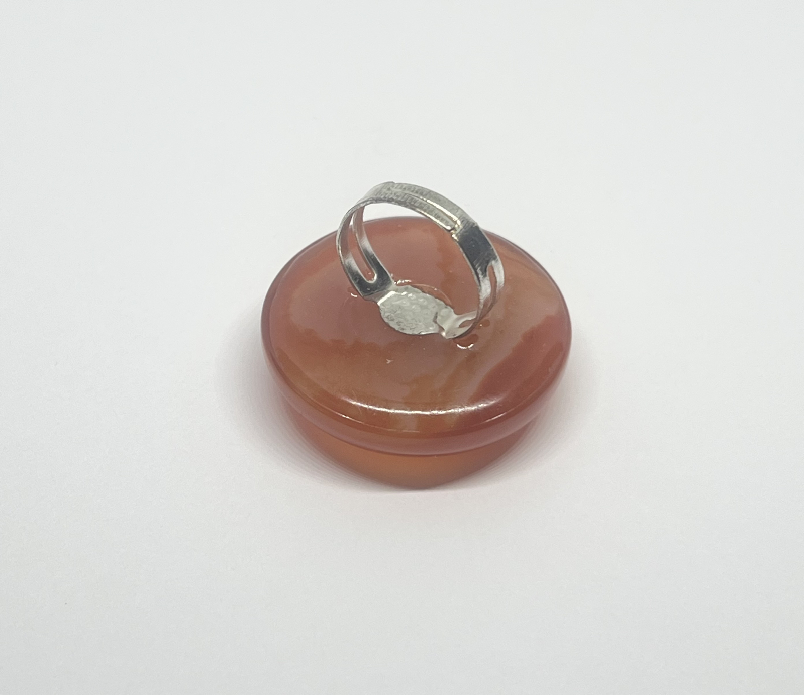 Inel realizat manual, cu piatră semiprețioasă de carneol, ce strălucește în tonuri de portocaliu intens și roșu-auriu. Fiecare piatră are un joc unic de dungi și reflexii, amintind de apusurile de vară. Baza metalică argintie este fixată cu rășină transparentă, oferind o montură solidă și elegantă.