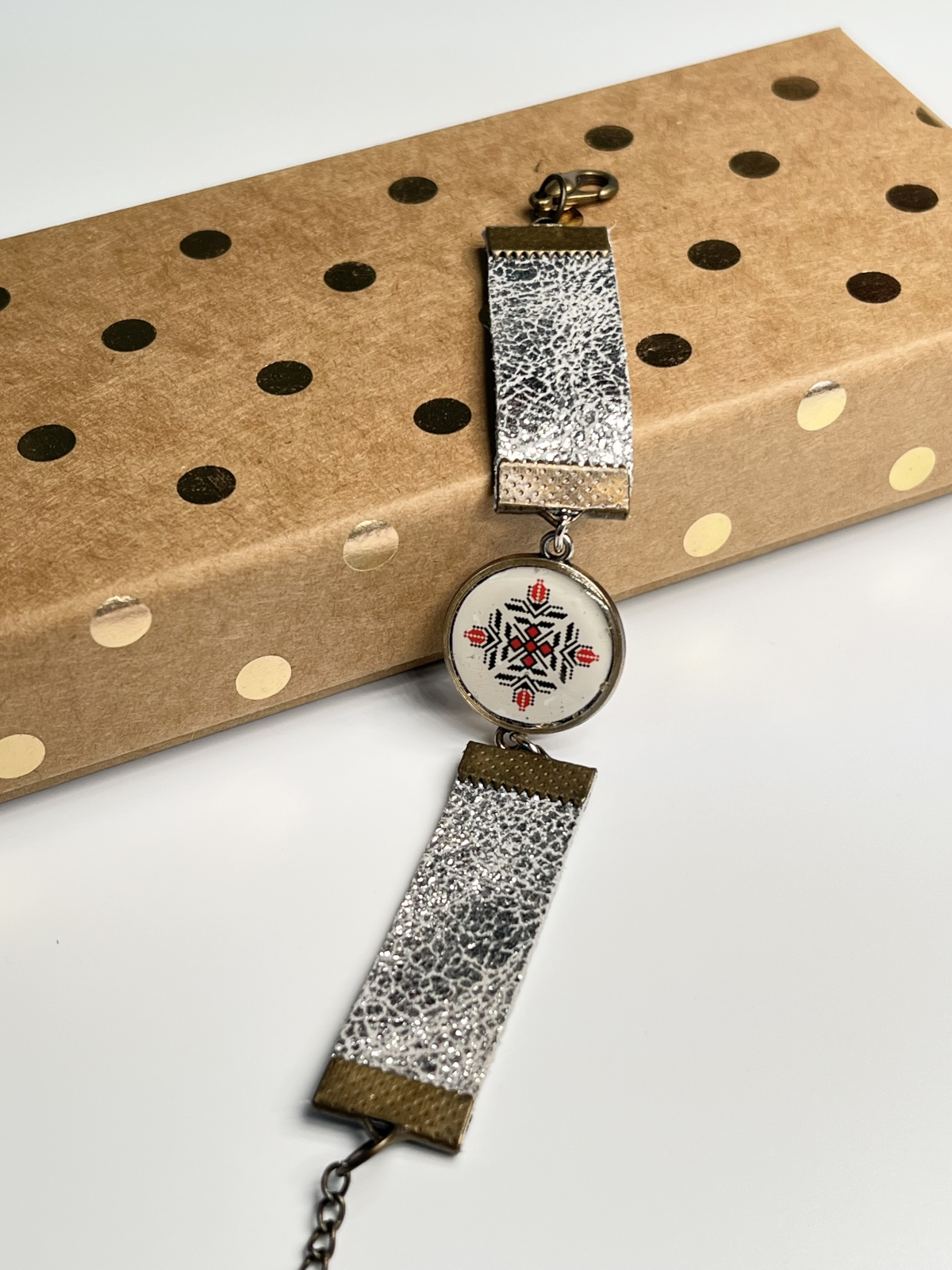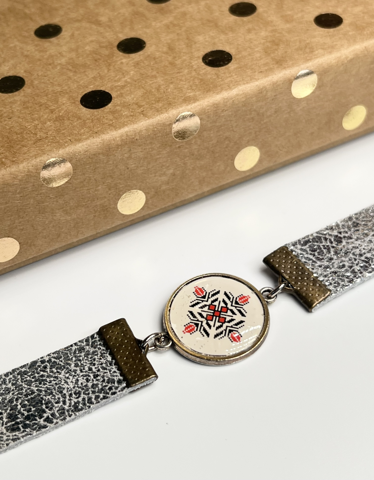 Brățări realizate manual din piele naturală, cu un design unic și detalii care spun o poveste. Fiecare piesă are în centru un link metalic decorativ cu print artistic, protejat cu rășină transparentă pentru un aspect lucios și o durabilitate crescută. Metalul cu aspect antichizat și culorile vibrante ale pielii se îmbină armonios, oferind un accesoriu elegant, potrivit atât pentru ținutele casual, cât și pentru cele cu accente tradiționale.