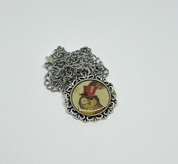 Colier handmade cu pandantiv rotund, decorat cu o bufniță elegantă purtând joben și monoclu – un detaliu amuzant și rafinat în același timp. Printul este sigilat manual cu rășină epoxidică lucioasă, care îi oferă profunzime și protecție. Un accesoriu perfect pentru personalități creative și jucăușe.