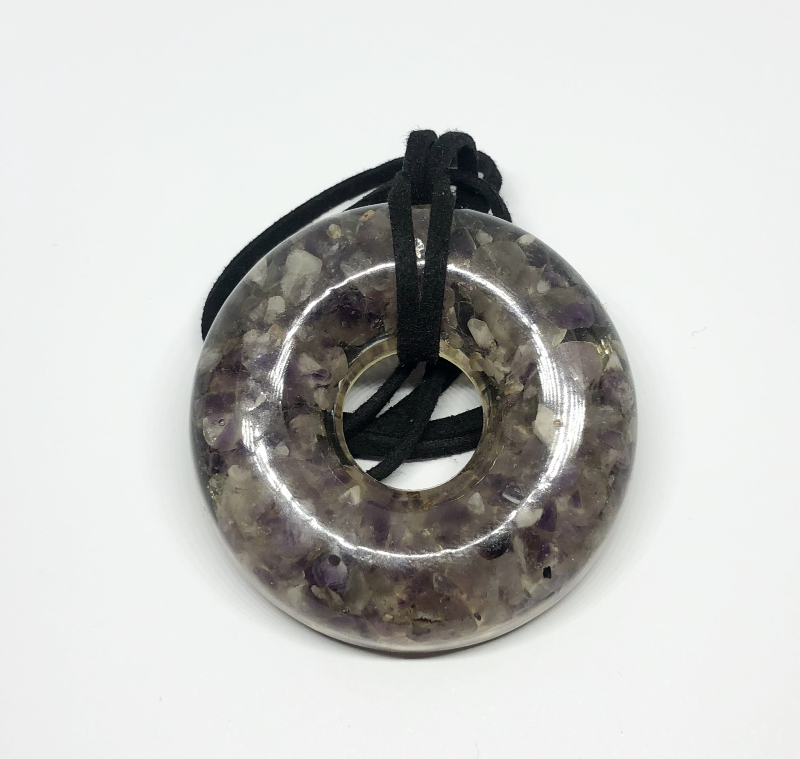 „Cercul Ametistului” este un colier handmade cu design circular, realizat din rășină epoxidică transparentă în care sunt încapsulate fragmente autentice de ametist. Forma sa rotundă, echilibrată, simbolizează ciclicitatea, protecția și claritatea interioară.