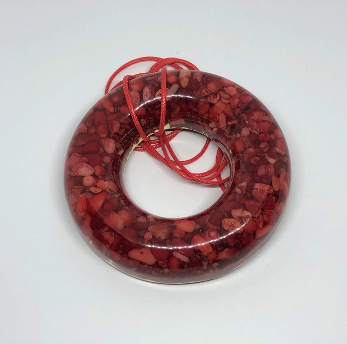 Colierul „Cercul Vitalității” este o bijuterie handmade plină de personalitate, creată din rășină epoxidică lucioasă, cu fragmente de coral roșu natural. Designul său circular – simbol al echilibrului și continuității – este pus în valoare de nuanțele intense de roșu care atrag privirile și transmit putere.