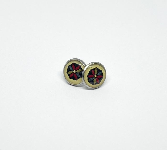 Cercei cu model tradițional în culori contrastante, roșu,negru si verde dispuse simetric pe fond crem. Un simbol puternic al echilibrului și stabilității, învăluit într-o notă modernă.