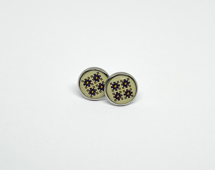 Cercei cu model geometric tradițional în nuanțe de violet și mov, pe fundal deschis. Realizați manual din rășină pe bază din oțel inoxidabil, acești cercei aduc o notă subtilă de eleganță și mister.