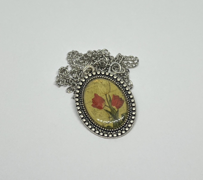 Colier elegant cu pandantiv oval, decorat cu un print fin de doi maci roșii pe fundal galben pal. Rășina lucioasă protejează imaginea și oferă un efect de sticlă. Model simplu, dar plin de delicatețe, perfect pentru iubitoarele de flori.