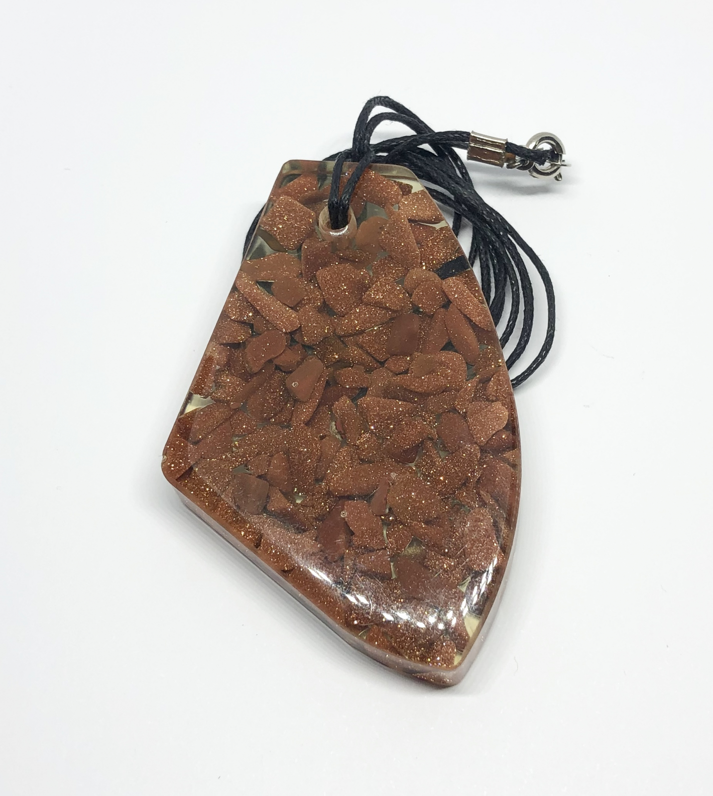 Fiecare colier „Flacăra Interioară” este o declarație de stil și energie. Creat din rășină epoxidică turnată manual, cu fragmente de Goldstone strălucitor, acest pandantiv cu formă asimetrică atrage toate privirile și inspiră încredere.