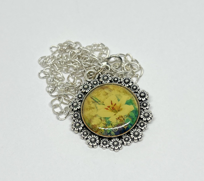 Colier handmade cu pandantiv rotund, decorat cu o floare galbenă luminoasă pe fundal texturat. Rășina aplicată manual oferă un efect de sticlă și protecție îndelungată, iar detaliile florale metalice completează designul într-un stil boho-vintage.