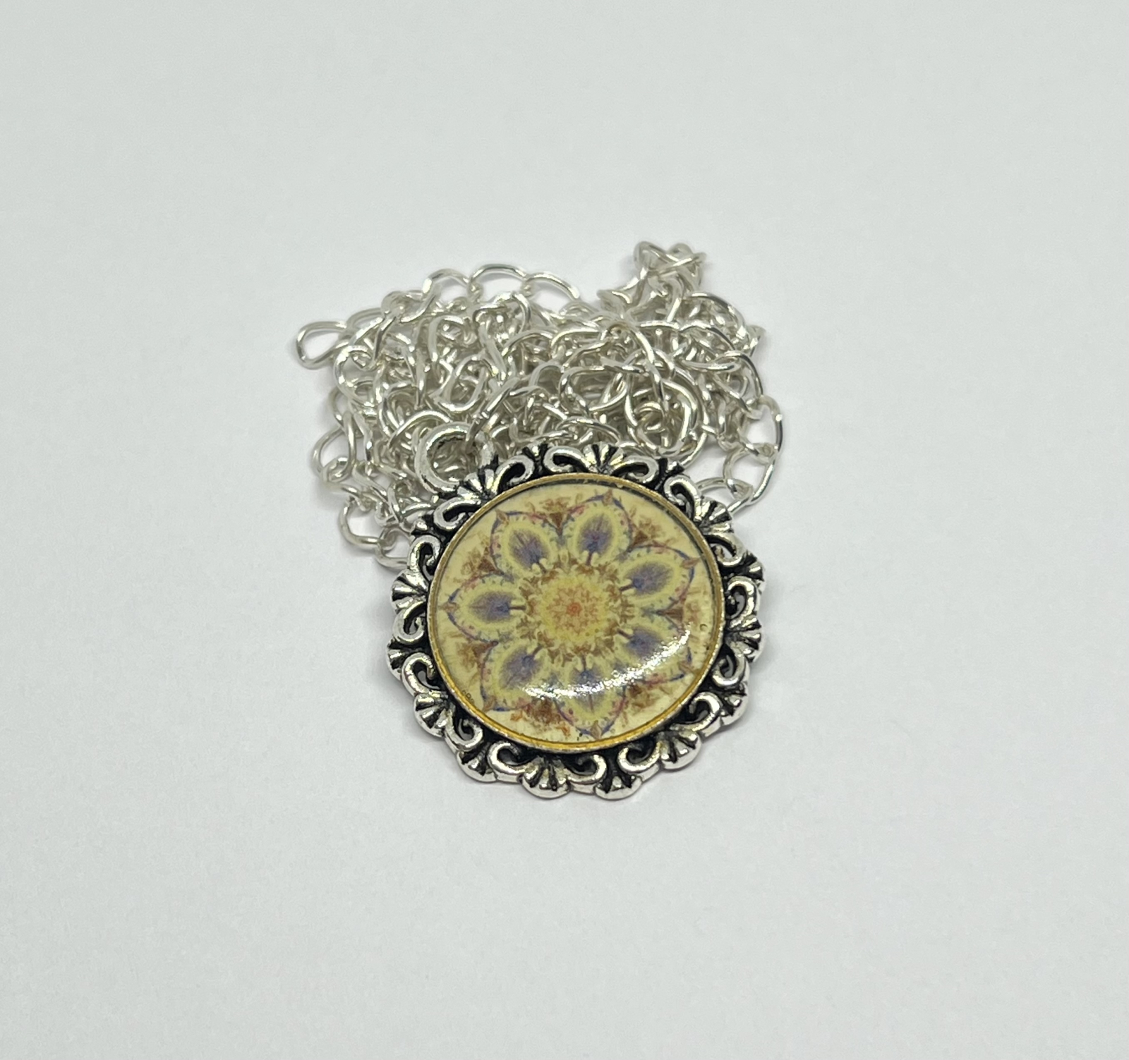 Colier handmade cu pandantiv rotund, decorat cu o floare geometrică în nuanțe de galben, mov și bej. Printul este sigilat manual cu rășină transparentă, pentru un efect lucios și durabil. Un model delicat și rafinat, inspirat din mandale florale.